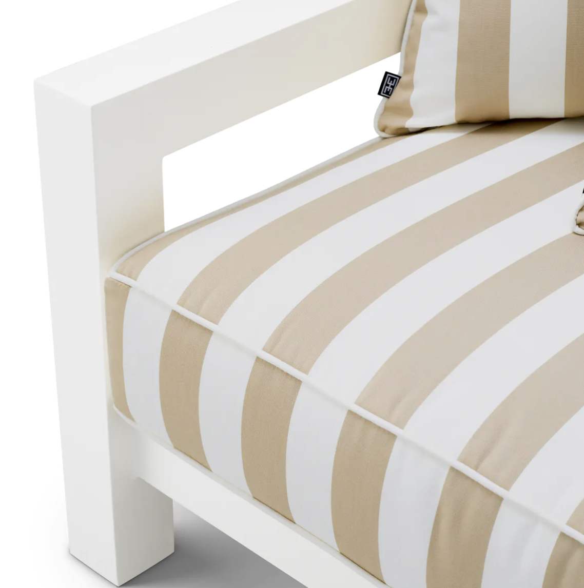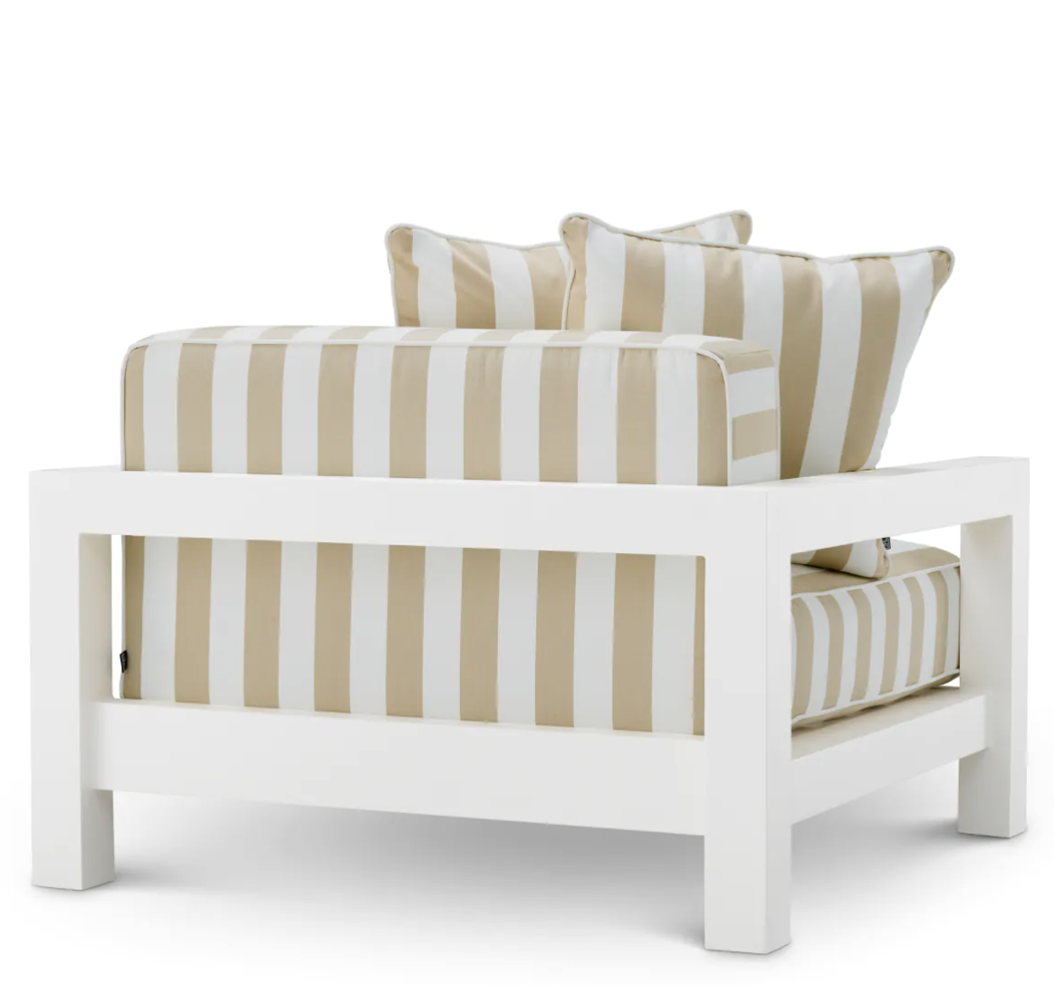 - The Cap-Antibes garden armchair by Eichholtz features a matte white aluminum frame and plush beige Florent cushions. Striped pattern, made of 100% dyed acrylic.