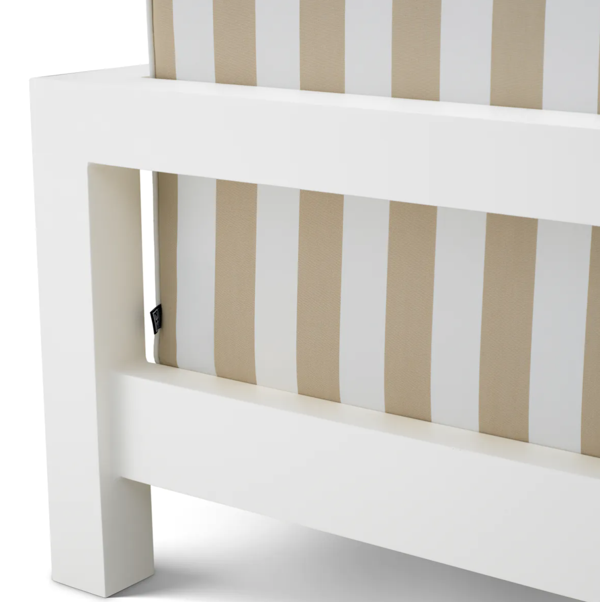 The Cap-Antibes garden armchair by Eichholtz features a matte white aluminum frame and plush beige Florent cushions. Striped pattern, made of 100% dyed acrylic.