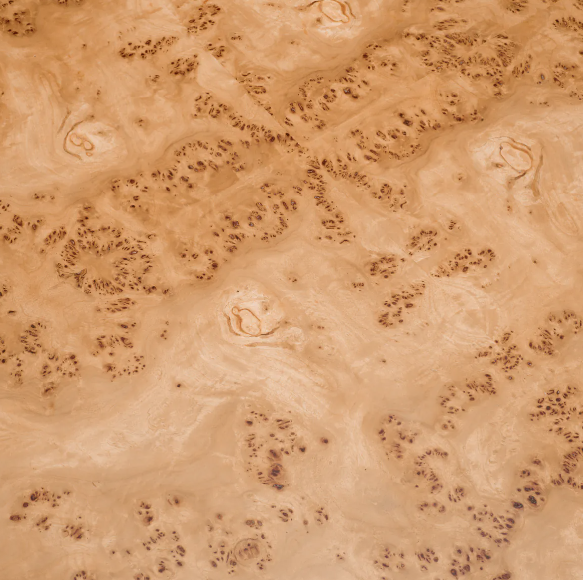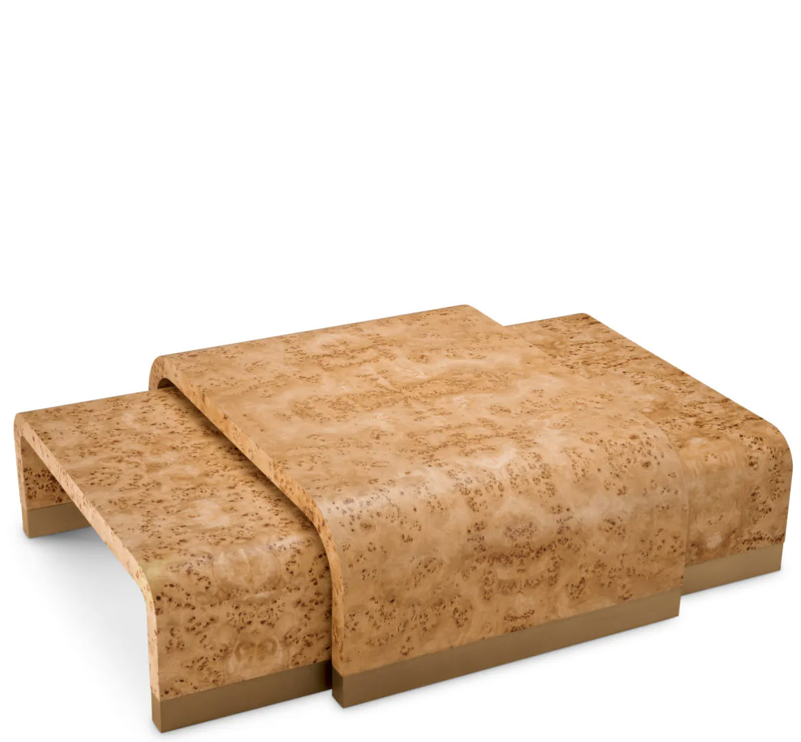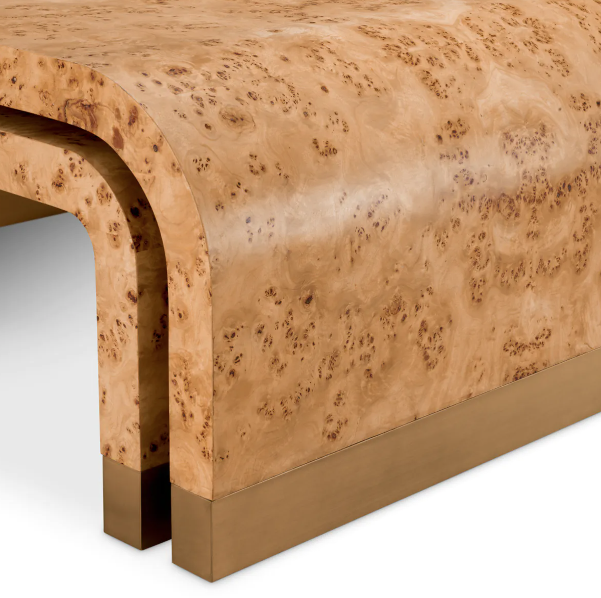 - Quinton coffee table by Eichholtz set of two, made of light brown mappa burl veneer, enhanced with antique brass finish.