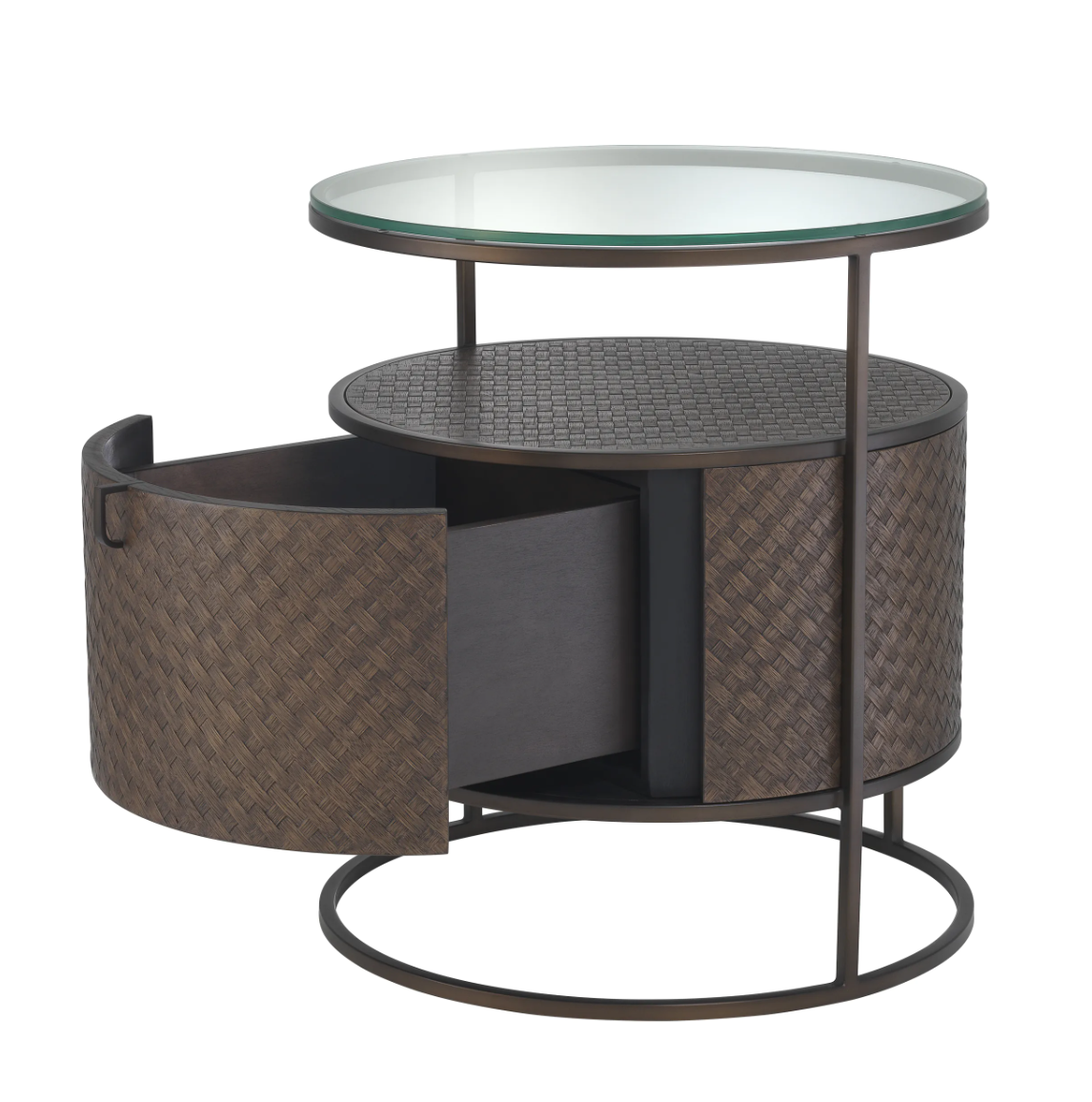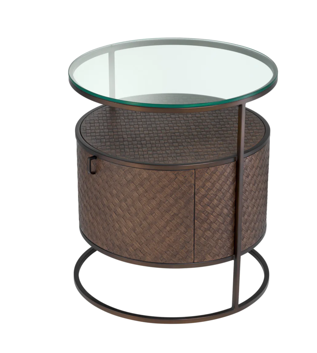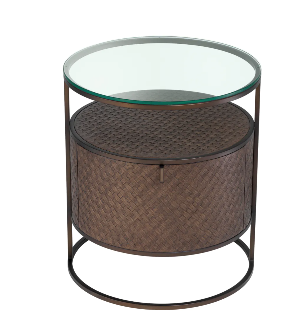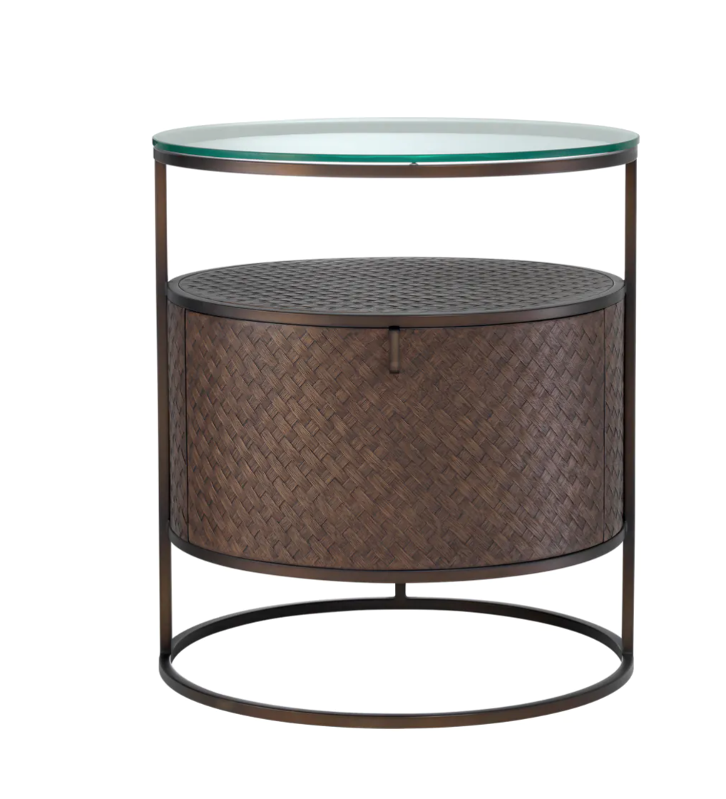 - Napa Valley bedside table by Eichholtz, presents a stainless steel frame, a clear glass top and a drum-shaped centrepiece lined with woven oak veneer, includes a drawer with handle.