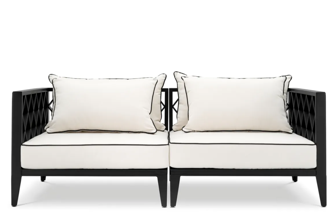 - The Eichholtz Ocean Club S garden sofa is made from sturdy materials and features a matte black frame and Sunbrella cushion covers finished with contrasting piping.