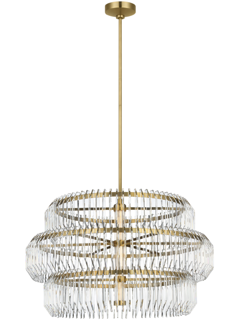 Killarney 32’ chandelier by Waterford in natural brass with clear crystal. Dimensions - O/A height: 158.8 cm. Unit height: 50.2 cm. Min. custom height: 68.6 cm. Width: 81.3 cm. Canopy: 14 cm round.