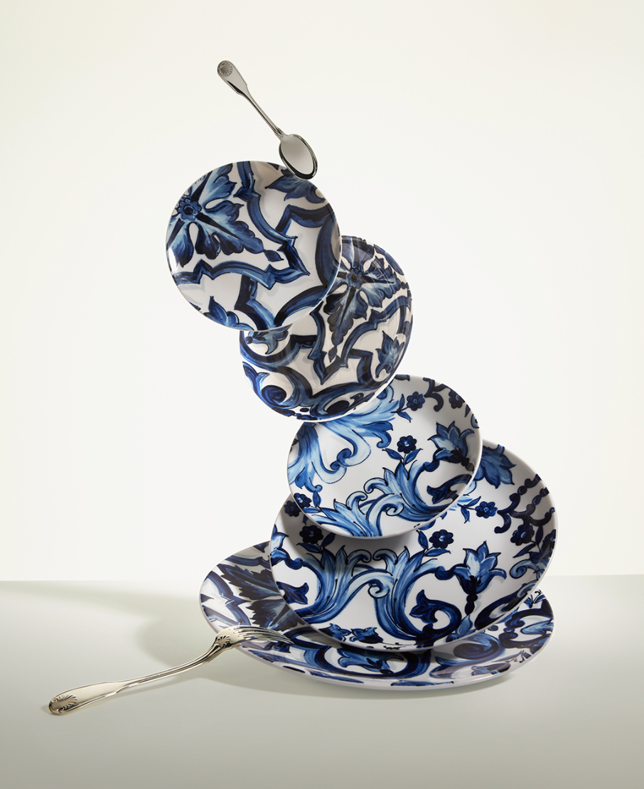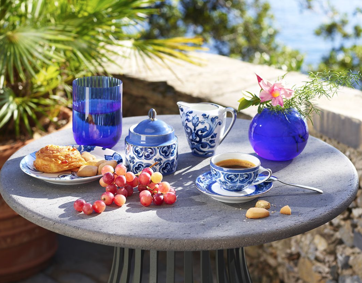 - The Dolce&Gabbana cup and cappuccino saucer from the Blu Mediterraneo, features the logo on the bottom and slightly raised details, thanks to the use of transparent glaze. Platinum brushstrokes along the rim provide an elegant finishing touch.