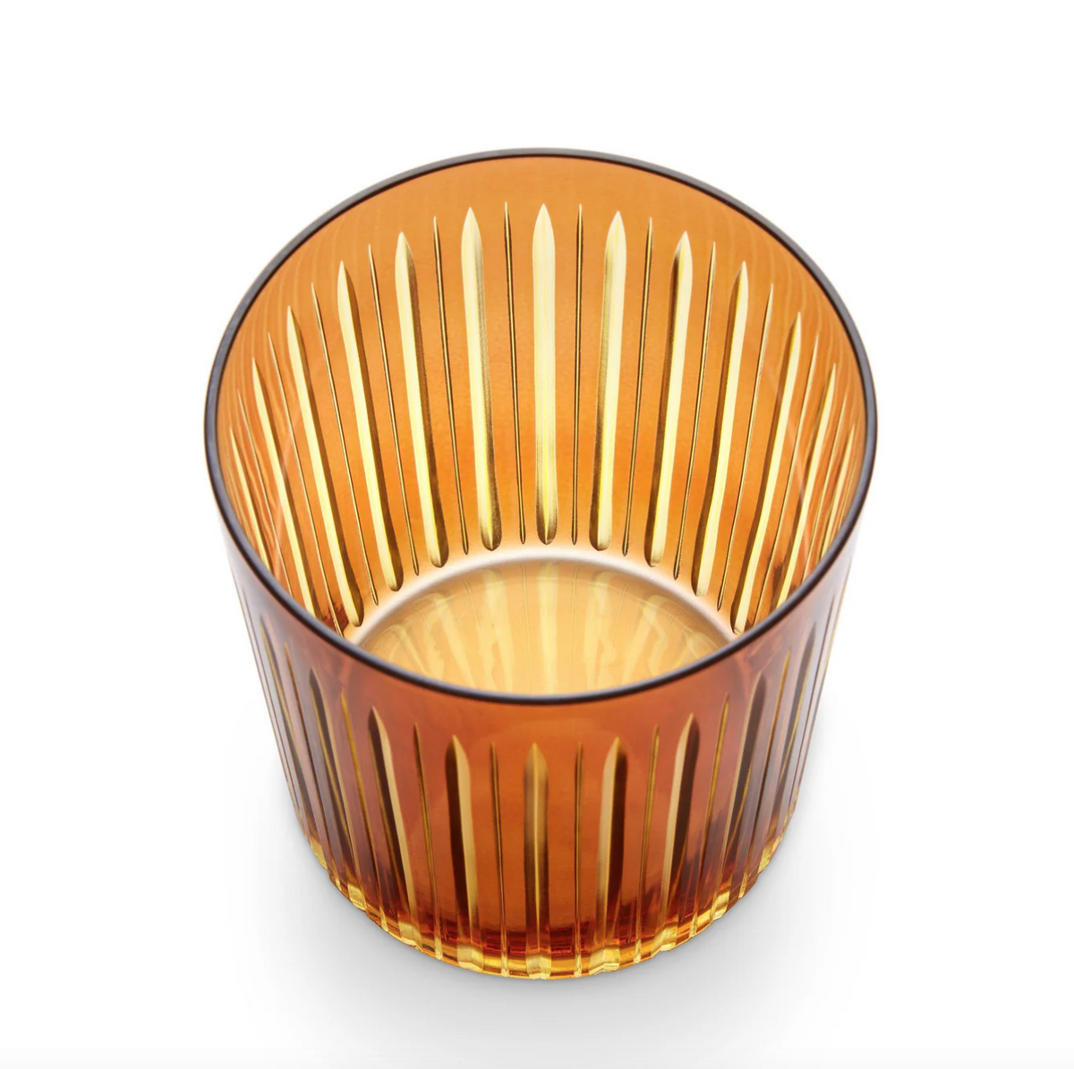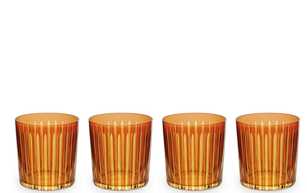Set of four L'Objet Prism glasses, hand-cut and decorated in amber. Also available in green, purple, and burgundy. Dimensions: 9 cm x 9.25 cm. Capacity: 38 cl