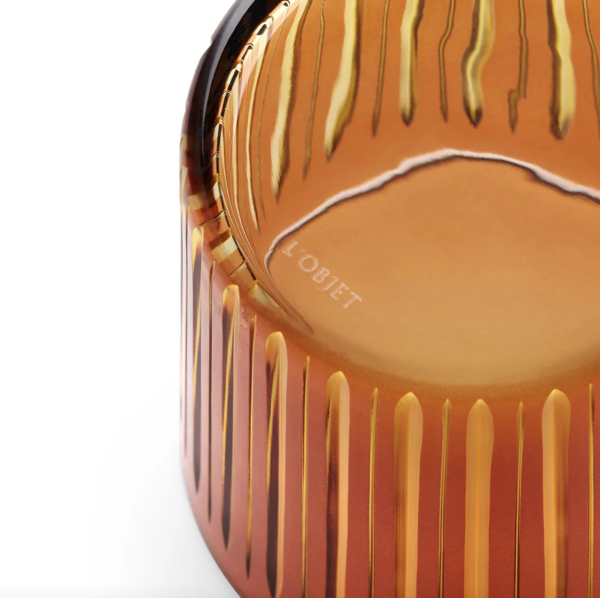 - Set of four L'Objet Prism glasses, hand-cut and decorated in amber. Also available in green, purple, and burgundy. Dimensions: 9 cm x 9.25 cm. Capacity: 38 cl