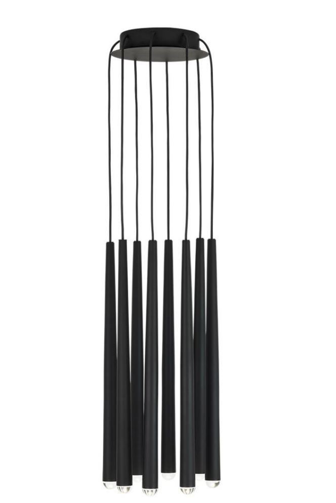 - The Pylon 8 chandelier, designed by Sean Lavin by Visual Comfort in black, has a long, tapered cylindrical metal body with domed optics.