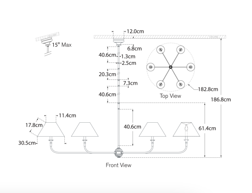 The Piaf Oversized chandelier designed by Thomas O'Brien by Visual Comfort in which natural steel rods intersect with wooden and metal hubs accentuated by simple candles and white shades. Dimensions: H 186.7 x W 182.9 cm