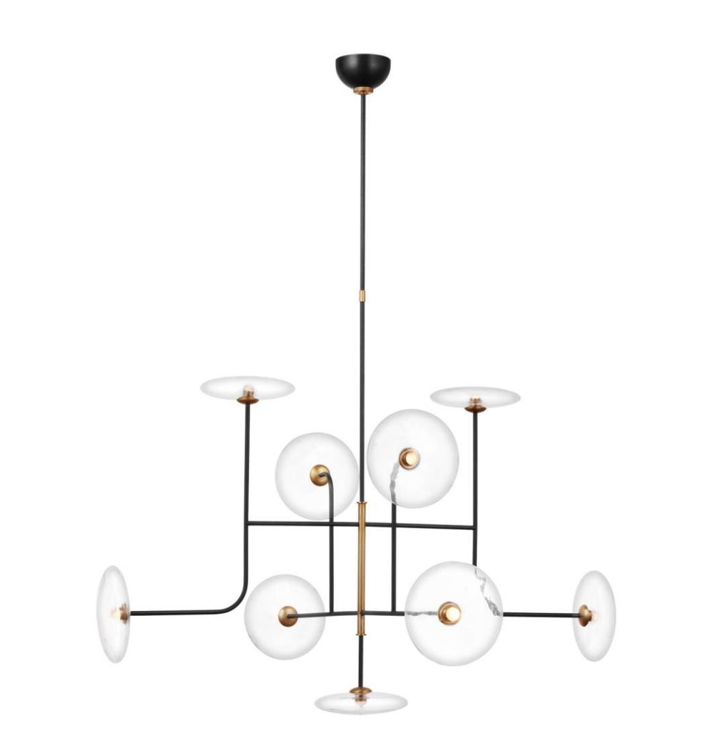 • The Calvino X-Large Arched Ian K.Fowler chandelier by Visual Comfort in which blown glass discs appear to float on metal stems. Miniature LED bulbs create a halo effect.