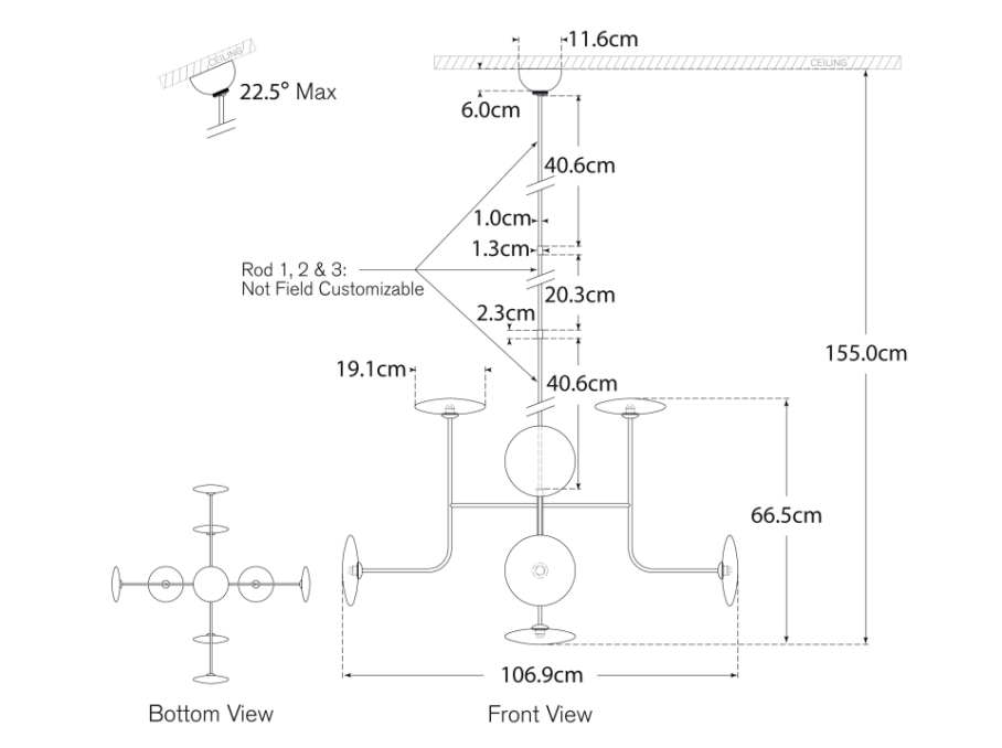The Calvino X-Large Arched Ian K.Fowler chandelier by Visual Comfort in which blown glass discs appear to float on metal stems. Miniature LED bulbs create a halo effect. Dimensions: h.132.7 x w.106.7 x canopy 11.4 cm