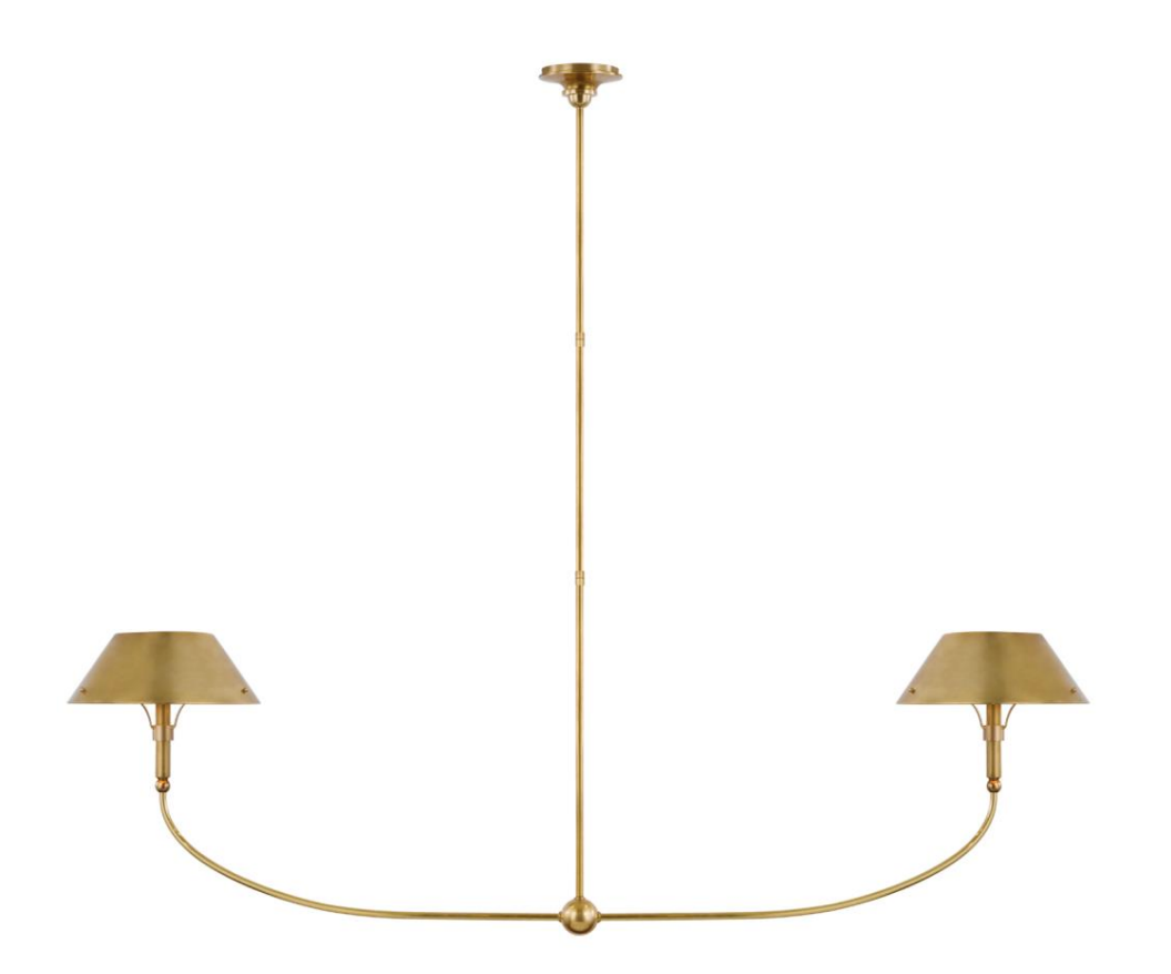 • Thomas O'Brien's Turlington XL pendant lamp by Visual Comfort in an antique brass finish. Its arms curve in a streamlined, sculptural shape.
