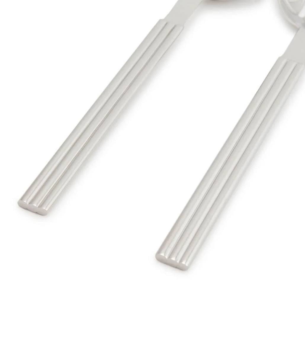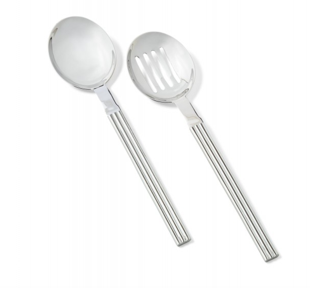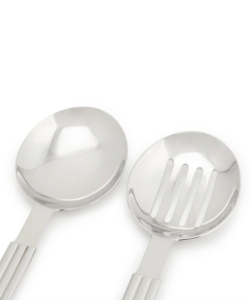 The Thorpe set of stainless steel serving spoons by Ralph Lauren Home in polished silver, have ribbed stripes reminiscent of the Hudson St. RL chair. Dimensions of both spoons: length 31.8 i x width 7.6 cm
