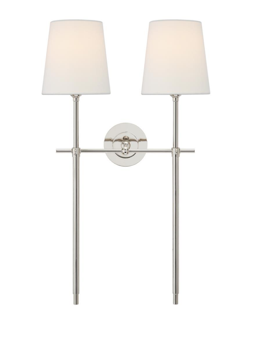- Bryant Large Double wall lamp by Thomas O'Brien by Visual Comfort in polished nickel, finished with a linen lampshade. The lamp has sockets for E 27 bulbs