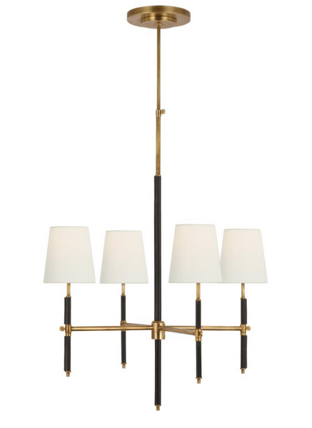 • Bryant Small Wrapped chandelier by Thomas O'Brien by Visual Comfort in antique brass with dark chocolate leather detailing and linen shades.