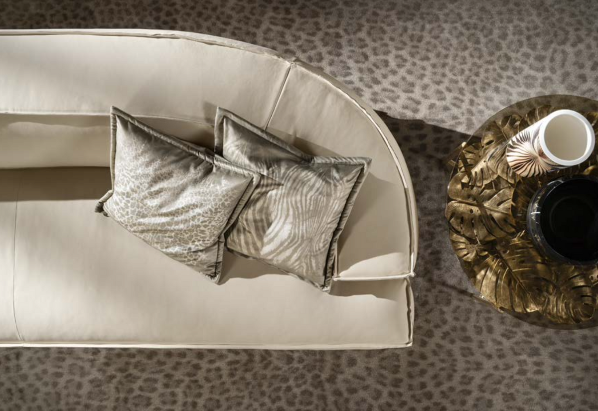 Assal three-seater sofa by Roberto Cavalli Home with construction in solid poplar wood, multi-ply pine and expansive polyurethane foam. Upholstery in leather cat. A Sauvage col. Ivory colour with decorative stitching along the perimeter. Dimensions: L 295 D 122 H 71 cm.