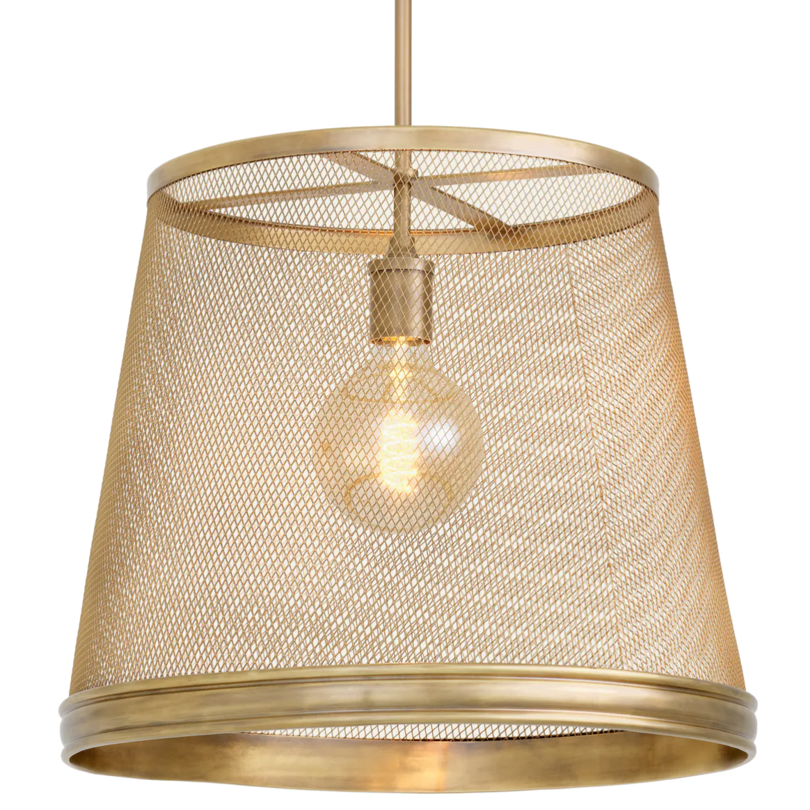 - The Colindale pendant lamp by Eichholtz, crafted entirely from brass in a vintage style, features a shade with a woven mesh pattern that creates a striking visual effect.
