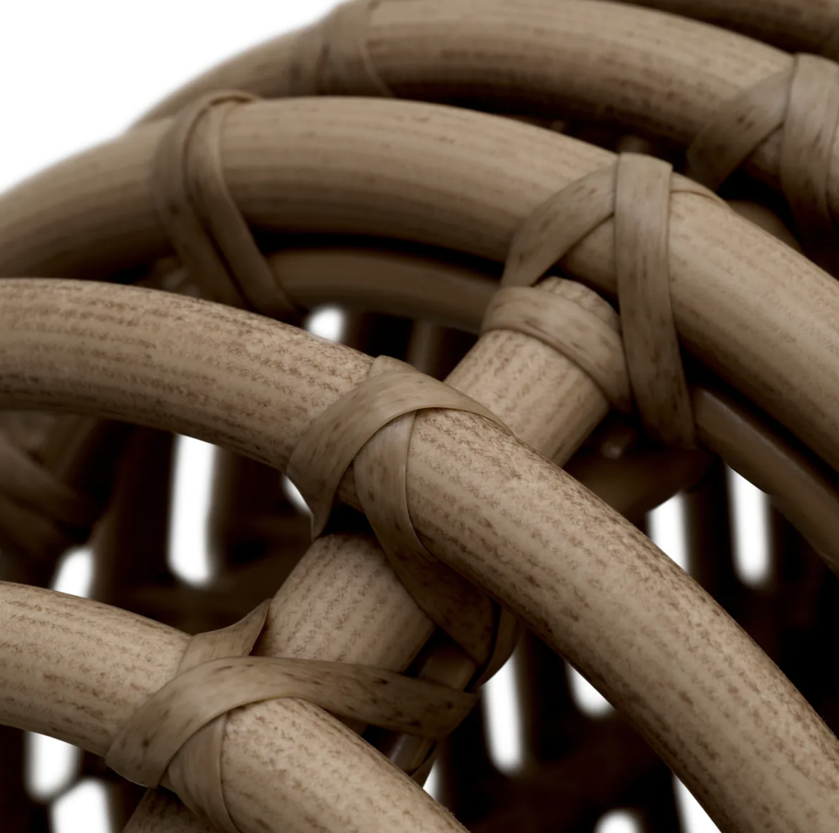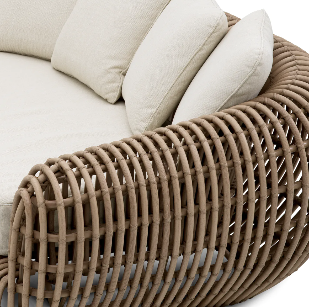 - The Eichholtz Siderno garden sofa is crafted from faux rattan that complements the Viola Sand fabric perfectly. The numerous cushions provide a soft finish. Dimensions: W. 229.5 | D. 128.5 | H. 68 | SD. 60 | SW. 169.5 | SH. 42 | AH. 55 cm