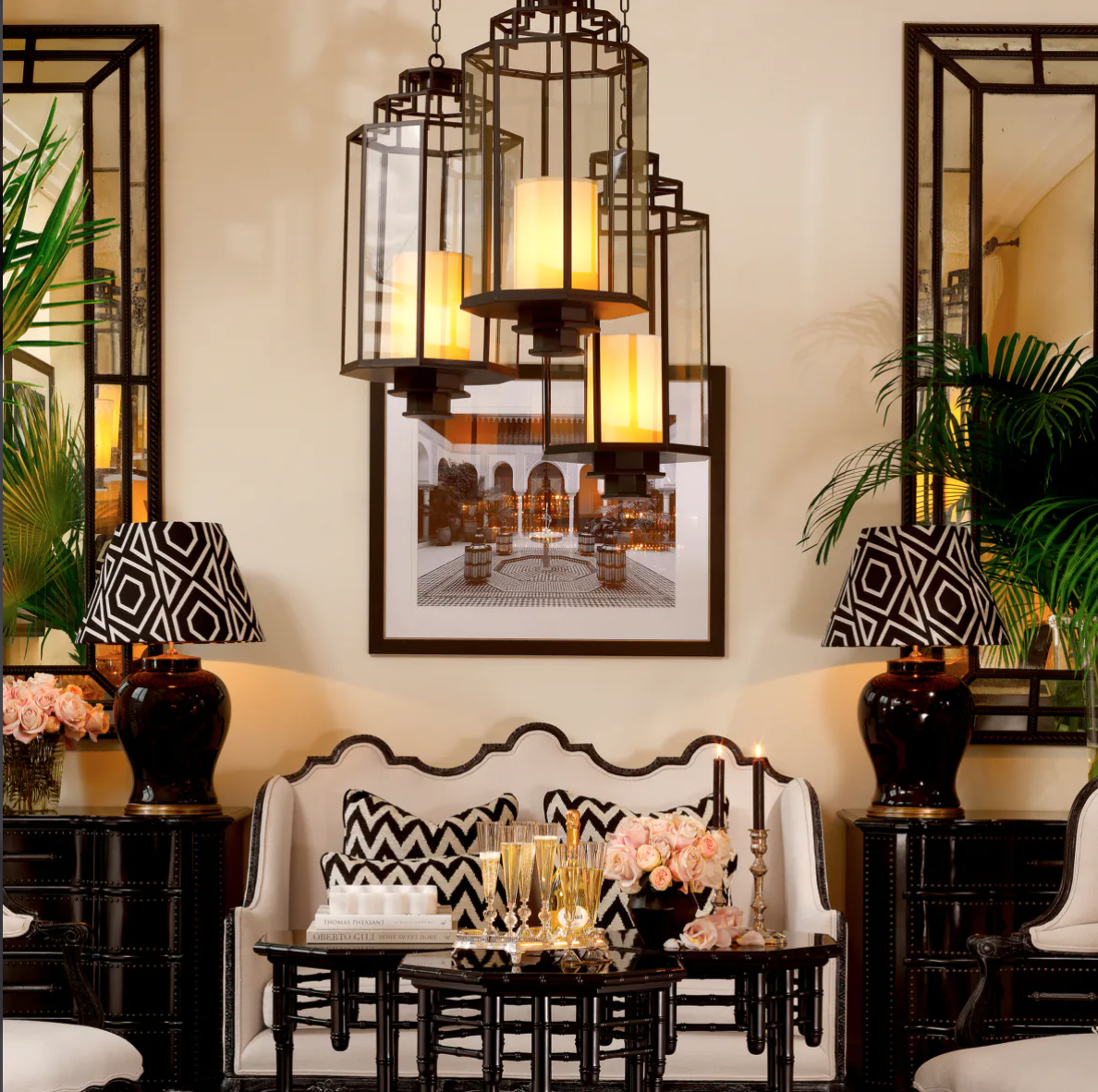 - The Monticello L pendant lamp by Eichholtz, crafted from metal with a matte black finish, features an octagonal frame with clear glass panels. The lamp has an E27 bulb socket.