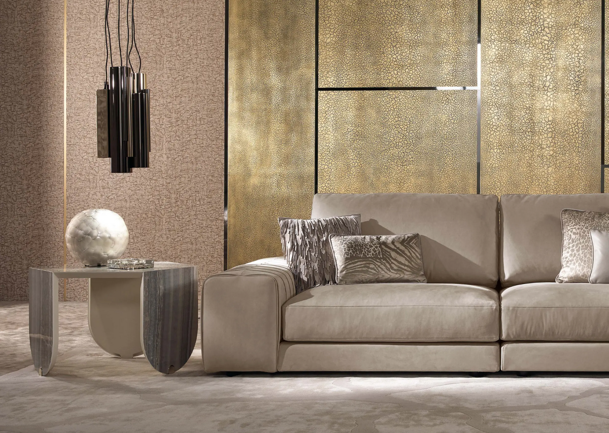 The Inagua table by Roberto Cavalli Home Interiors, crafted from a complex porcelain stoneware process, features a hexagonal top that contrasts with the curved lines of the legs. The structure is made of multi-layered wood and covered with porcelain stoneware from the collection. The lower part of the tabletop is lacquered in black (with black and dark porcelain stoneware) or ivory (with ivory or gray porcelain stoneware). The legs are finished in gold. Dimensions: L 130 x D 113 x H 36 cm