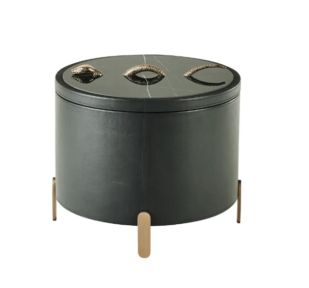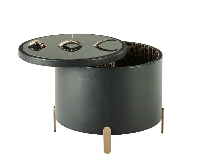 - The Nyoka coffee table by Roberto Cavalli Home Interiors features a multi-layer poplar wood structure and silk upholstery. It features a porcelain stoneware top and metal legs with brass snake-shaped details.