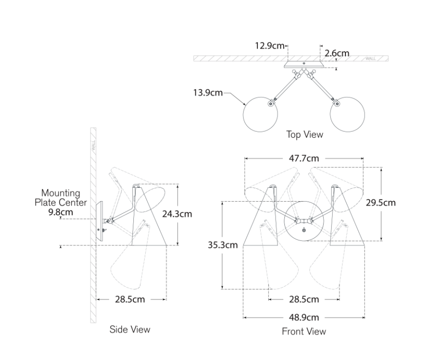 The Clemente Double wall lamp by Aerin is crafted from hand-polished antique brass with matte shades. The lamp has an E14 bulb socket with a switch on the back. Dimensions: H 24.1 x W 48.9 cm