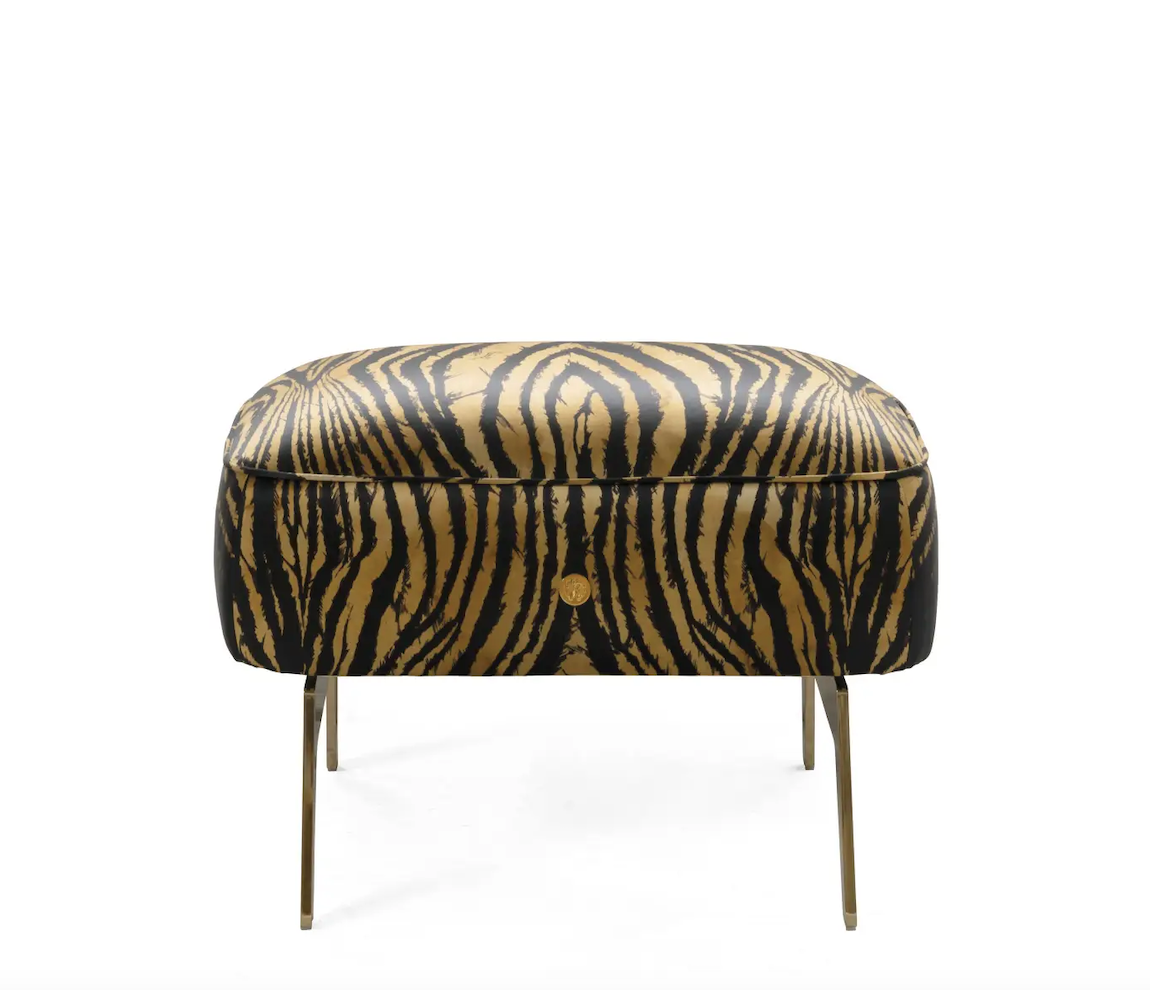 • The Guam footstool by Roberto Cavalli Home Interiors features a beechwood and foam structure, a metal base with a glossy or brushed finish, and a Category A fabric upholstery.