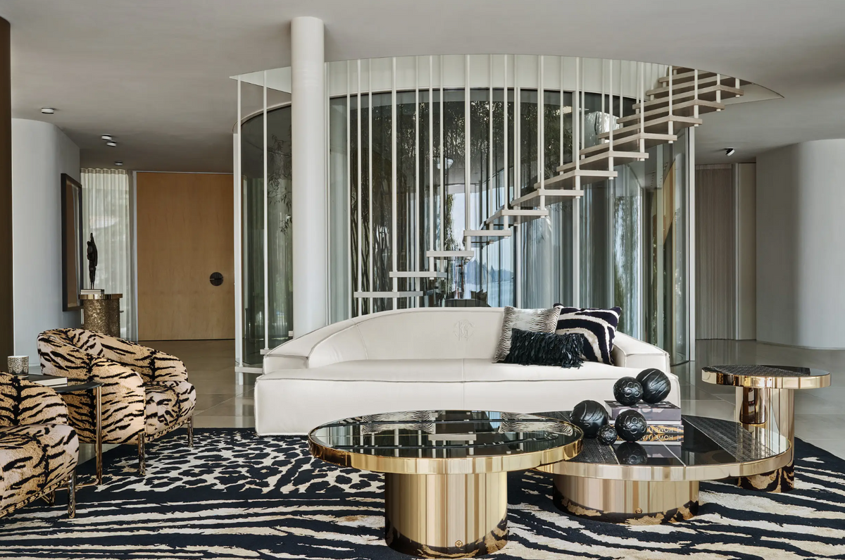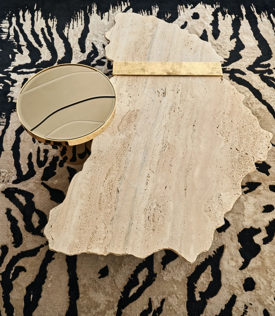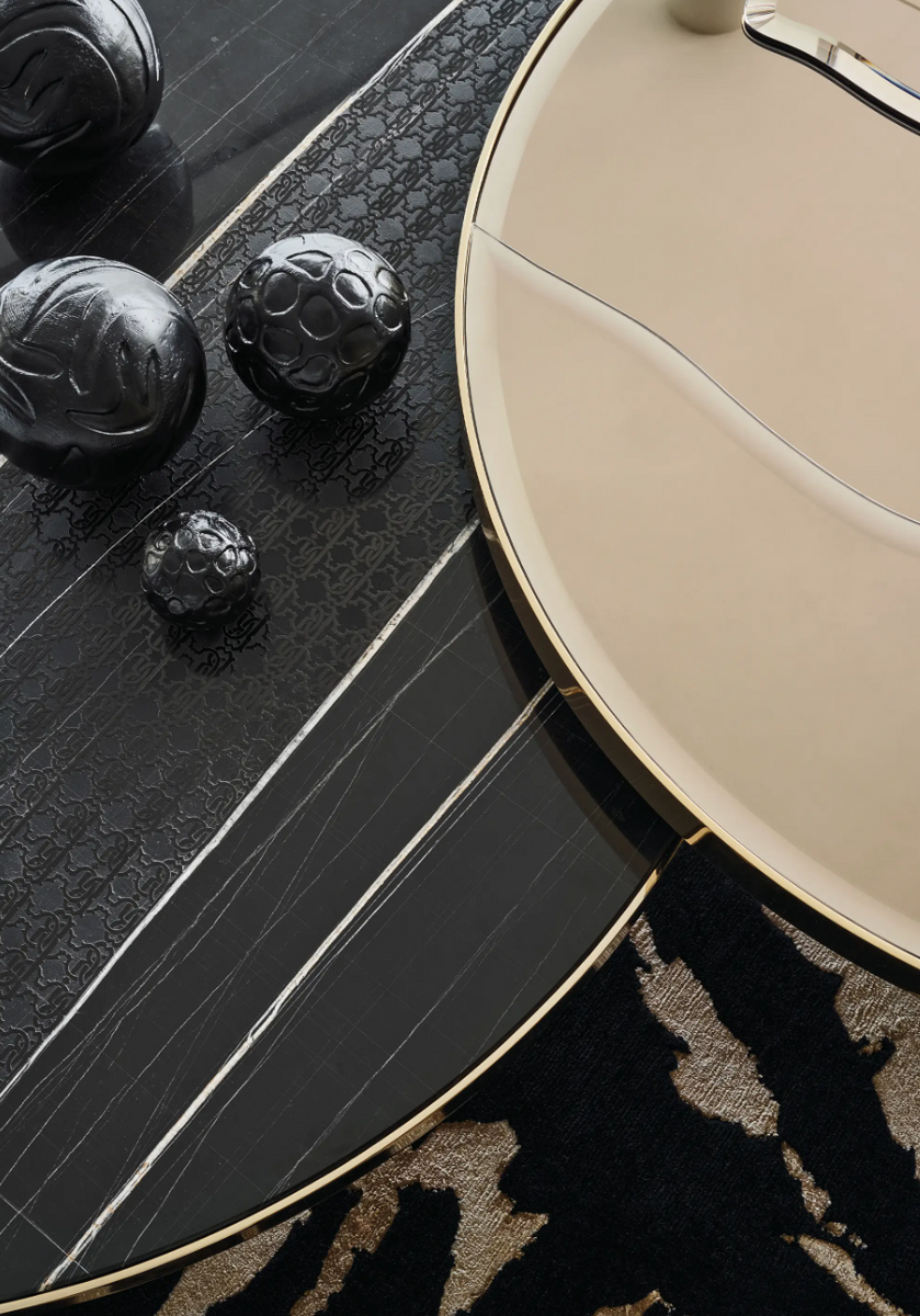 • The Sahara coffee table by Roberto Cavalli Home Interiors features a polished or brushed metal frame. The top is a polished Black Marquina marble. It is partially engraved with the RC monogram.