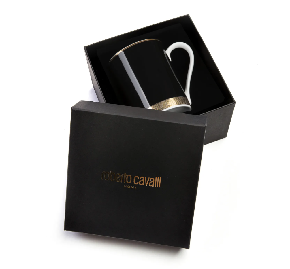 - Roberto Cavalli Home mug, from the Python Black collection, crafted from high-quality porcelain. The black band is framed at the top with a thin gold trim and at the bottom with a wider gold band featuring a snake motif.
