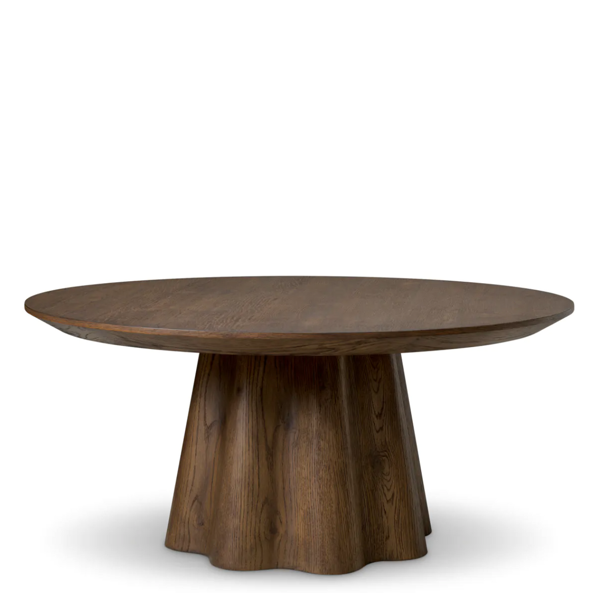 - The Papyrus table by Eichholtz features a sculptural form, crafted from dark brown oak veneer with a distinctive, open grain, drawing subtle inspiration from antique forms. Dimensions: Ø 100 cm | H 45 cm