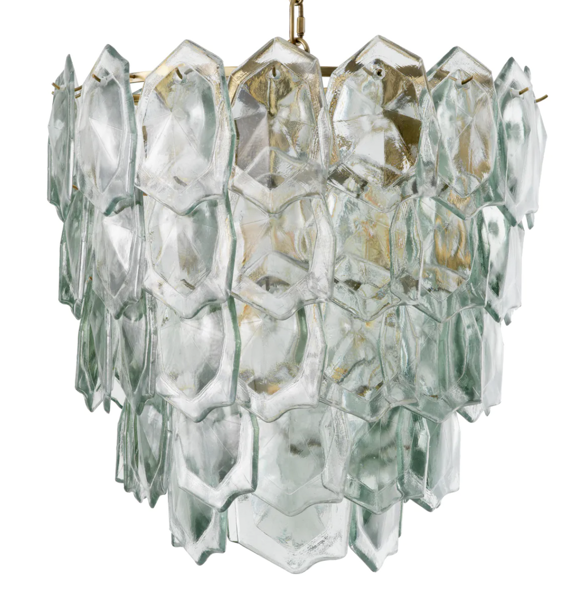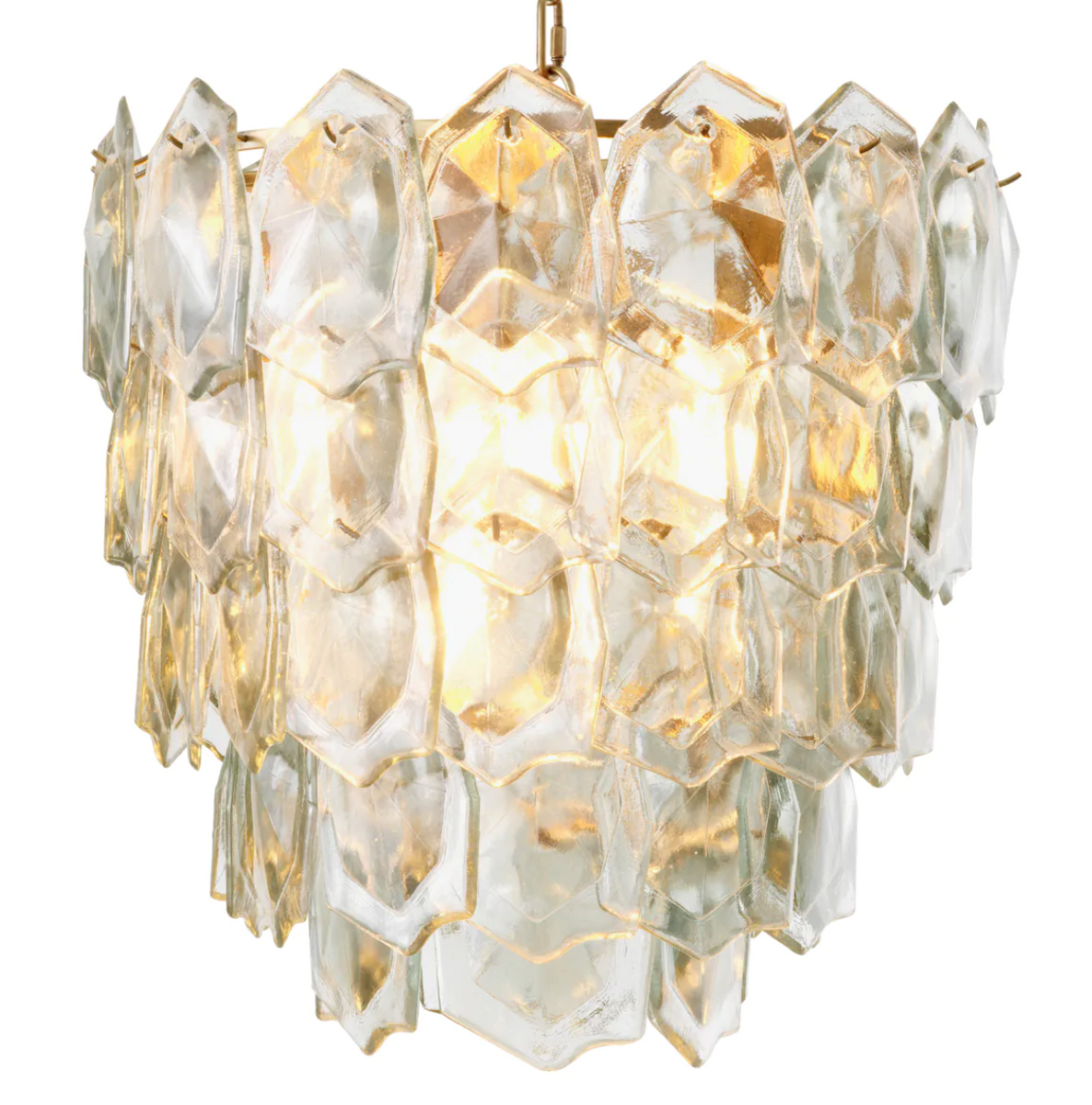 - The Eichholtz Elias chandelier, suspended from a chain, features a vintage brass finish and is adorned with over 60 handcrafted glass elements.