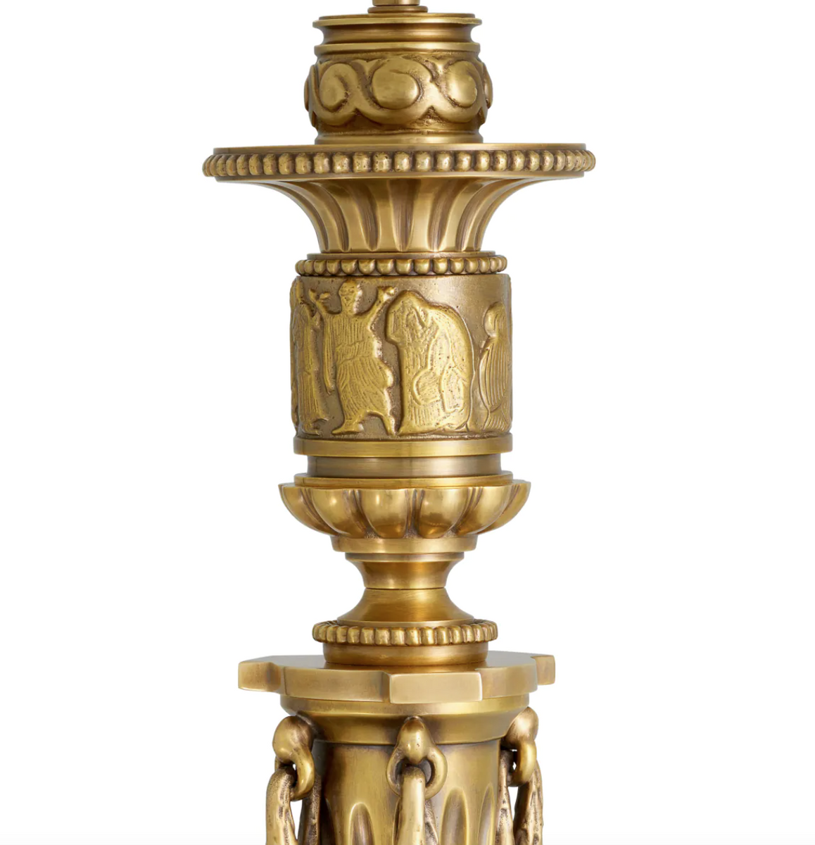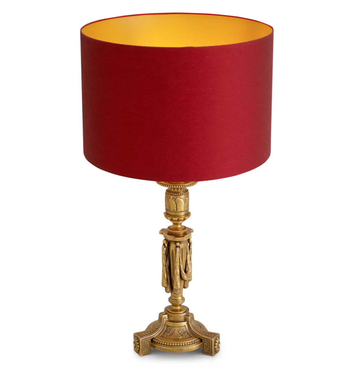 - The Francis table lamp by Eichholtz, with its antique gold silk shade and sculptural form, introduces a touch of old-world elegance and reflects timeless charm.