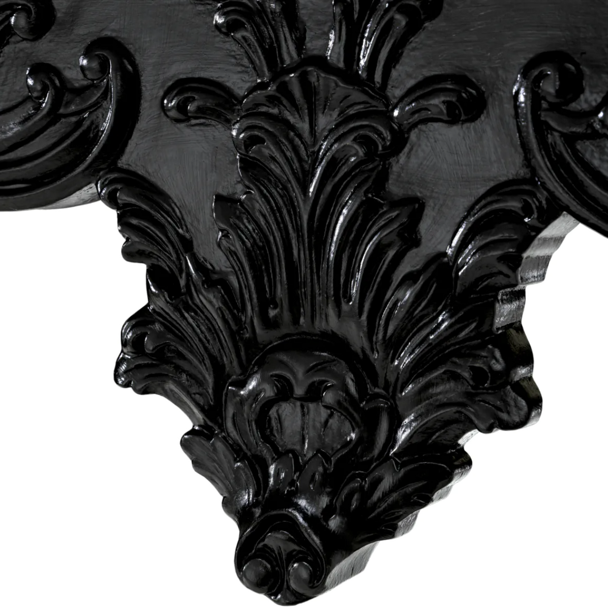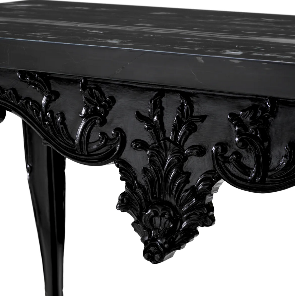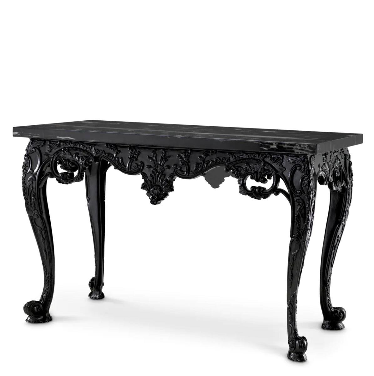 - The Eichholtz Cadwalader console table, crafted from black marble with a carved black wood base, embodies elegance and majesty. Its flowing lines and refined silhouette pay homage to 18th-century craftsmanship.