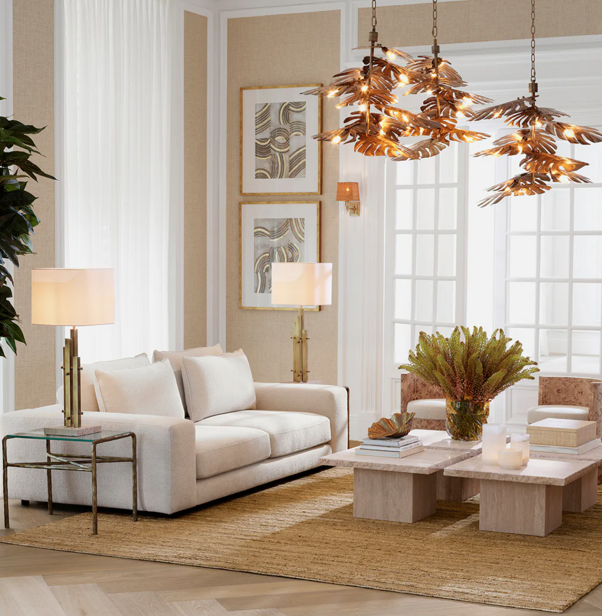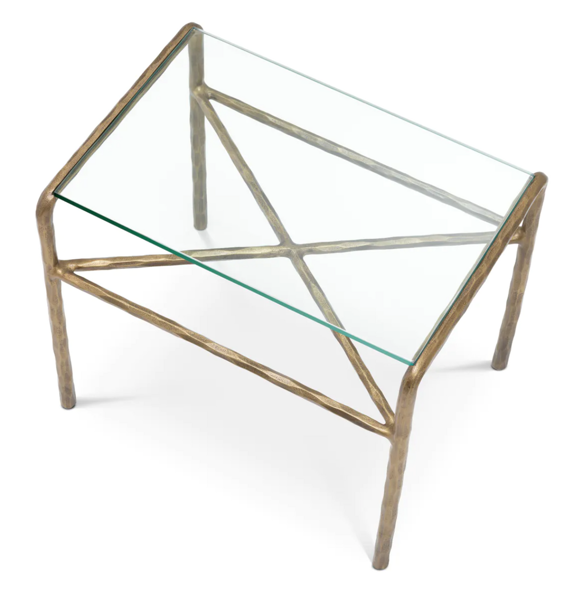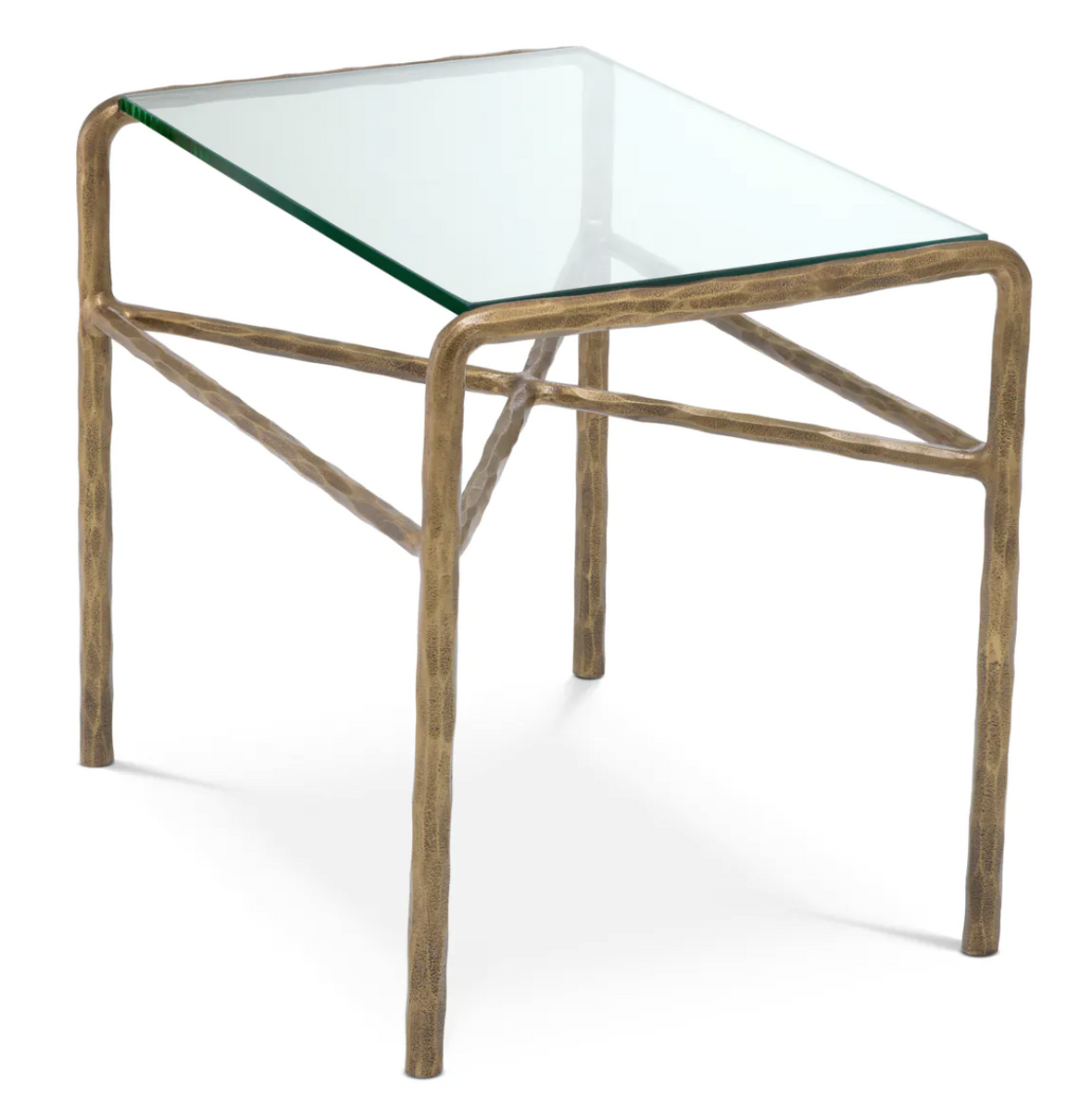 - The Xandria side table from Eichholtz features a clear glass top set on a hammered antique brass frame. It's a seamless blend of craftsmanship and functionality.
