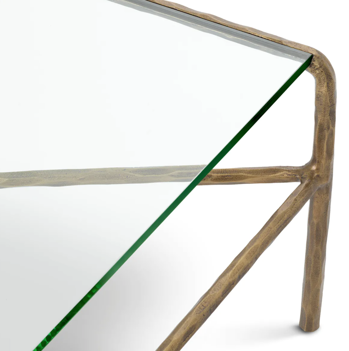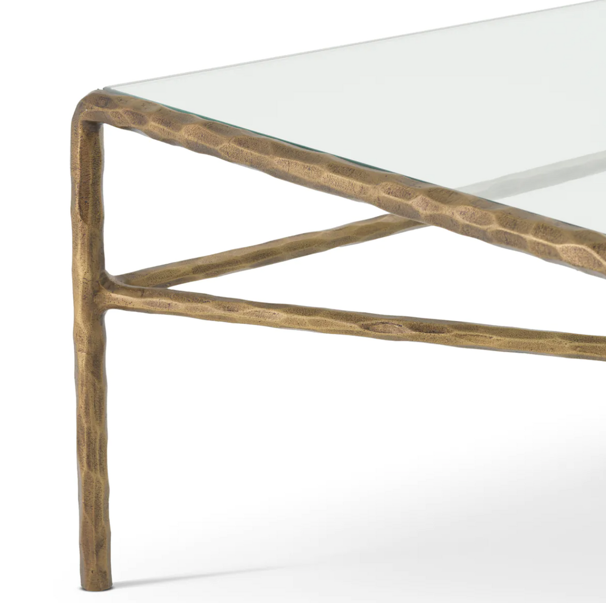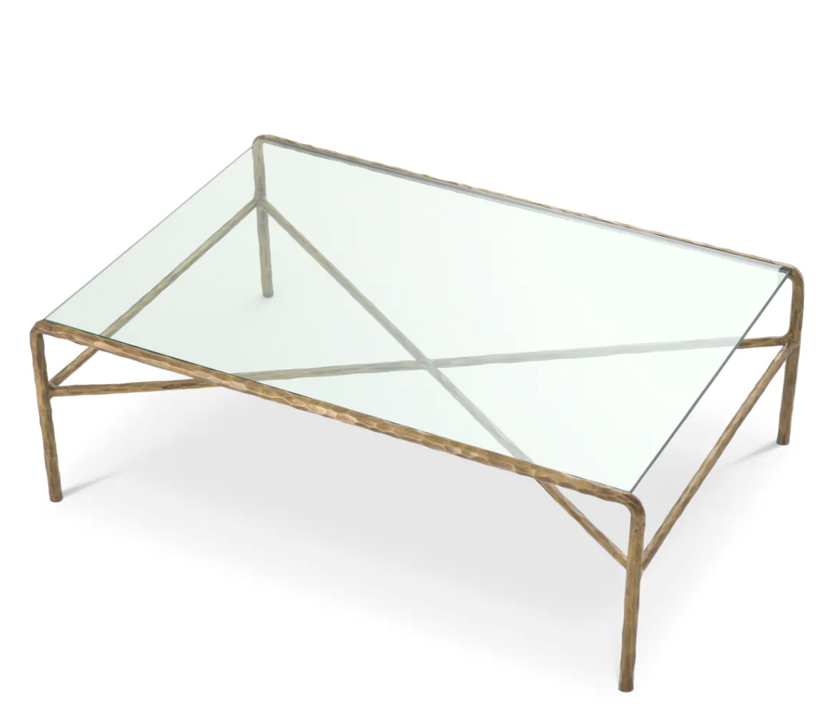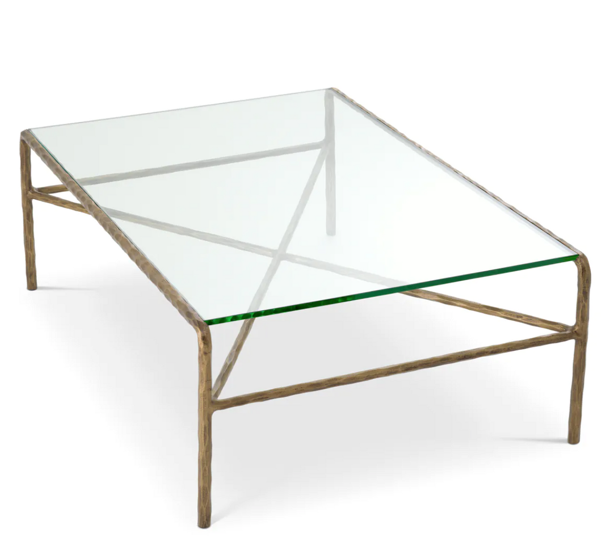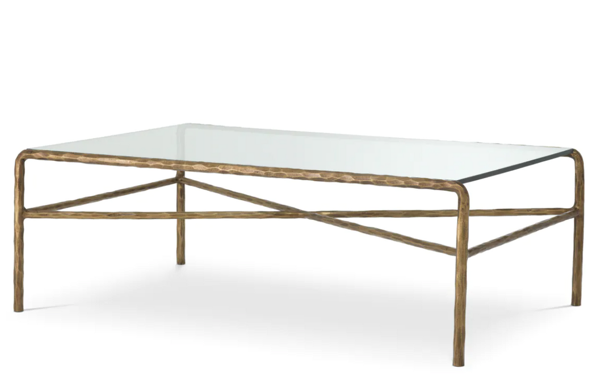 - The Xandria coffee table by Eichholtz features a clear glass top supported by a vintage brass frame, meticulously finished with a hammered texture, exuding refined elegance. Dimensions: W 120 cm | D 80 cm | H 40 cm