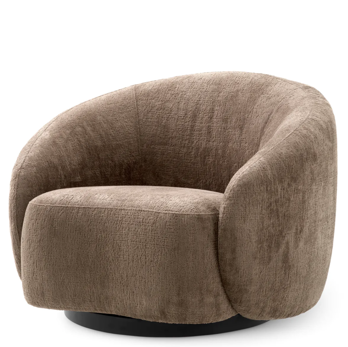 The Amore armchair by Eichholtz, upholstered in avelin brown fabric, features earthy tones wrapped around an elegant black base. It embodies a balance between warm texture and modern elegance. Dimensions: W. 97 | D. 91 | H. 74 | SD. 62 | SH. 43 | AH. 47 cm
