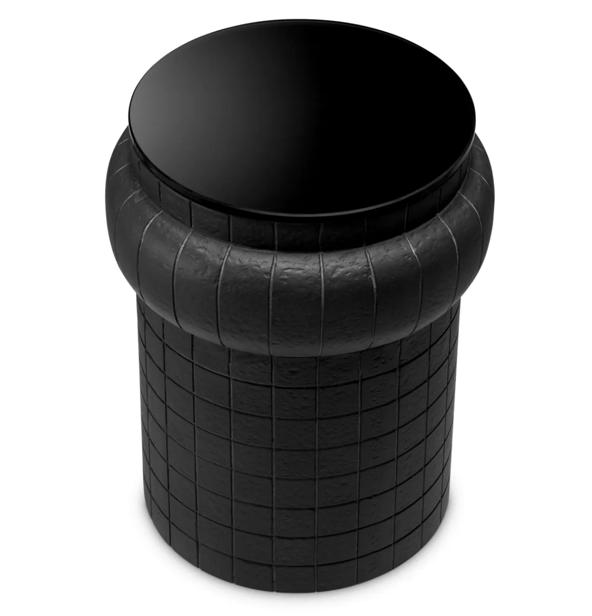 - The Tortugo side table from Eichholtz features a black glass top and a base decorated with a refined pattern that adds visual depth and artistic character. The mirrored surface highlights its modern charm.