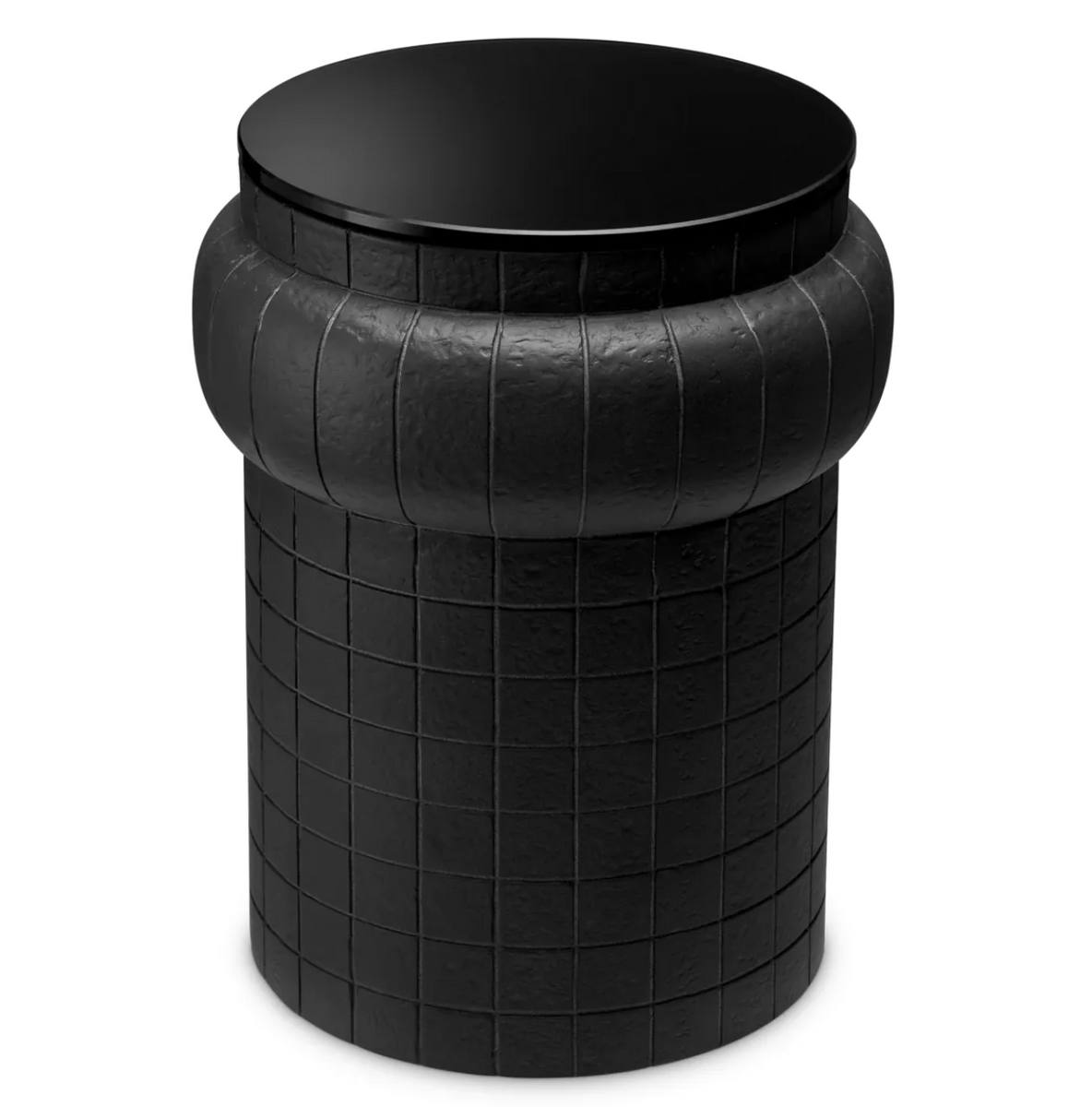 The Tortugo side table from Eichholtz features a black glass top and a base decorated with a refined pattern that adds visual depth and artistic character. The mirrored surface highlights its modern charm. Dimensions: Ø 40 | H 52 cm