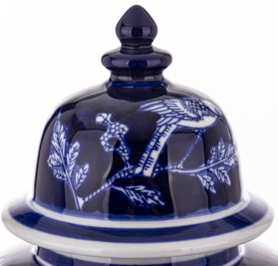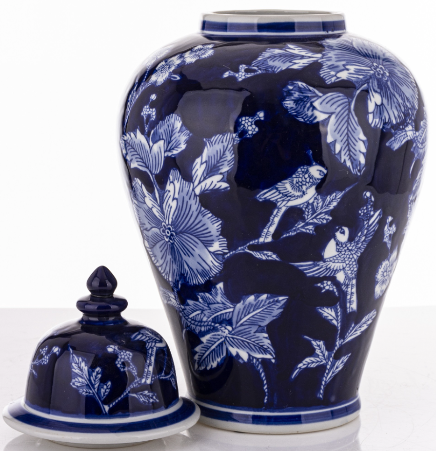 - The Midnight Blue Garden ceramic vase features an elegant design inspired by classic oriental porcelain. The deep navy blue combined with a bright floral and bird motif creates a sophisticated accent for stylish interiors. Dimensions: 37 x 19 x 19 cm