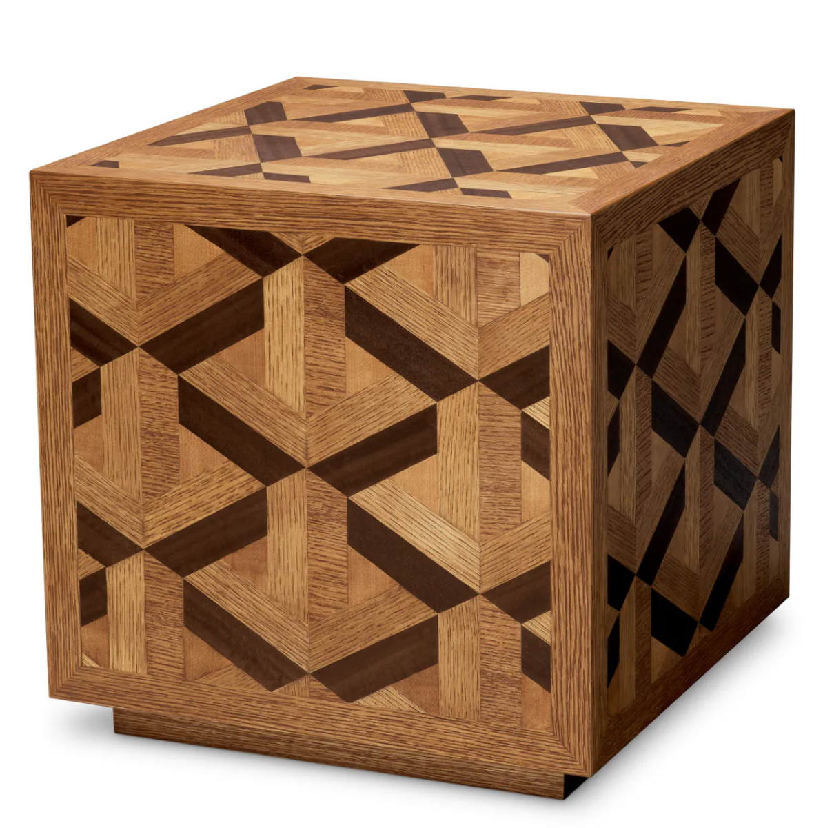 The Rubicon side table by Eichholtz, crafted using laser-cut veneer strips that are hand-assembled, pressed, joined, and seamlessly applied, reflects true craftsmanship. Dimensions: L 50 | W 50 | H 50 cm