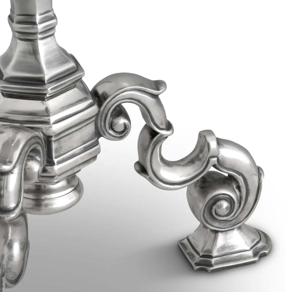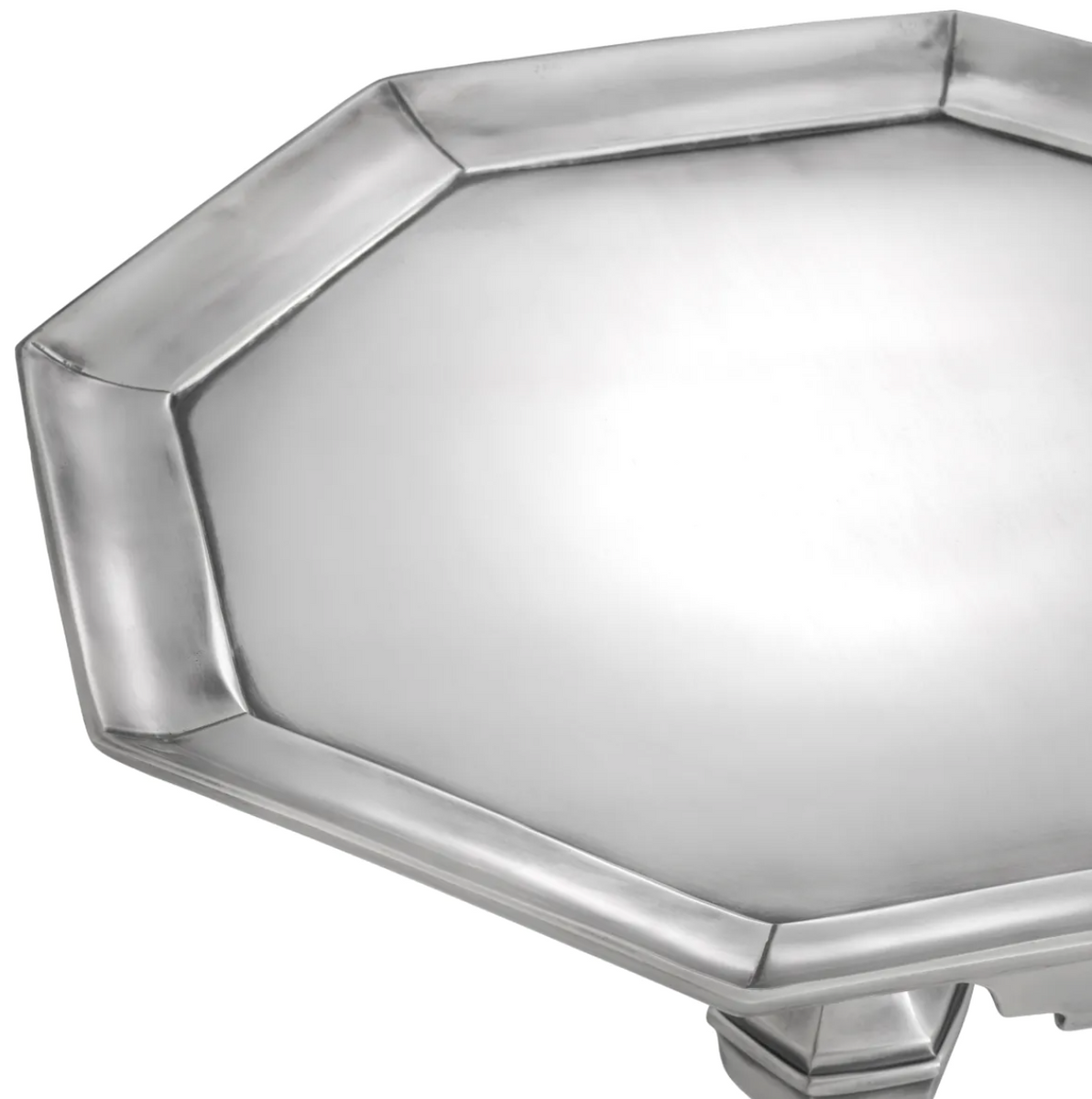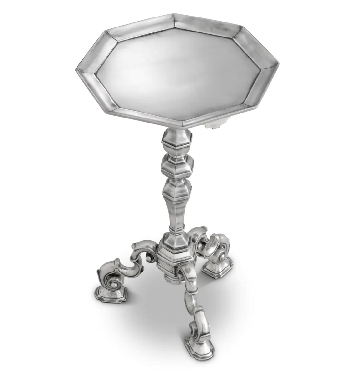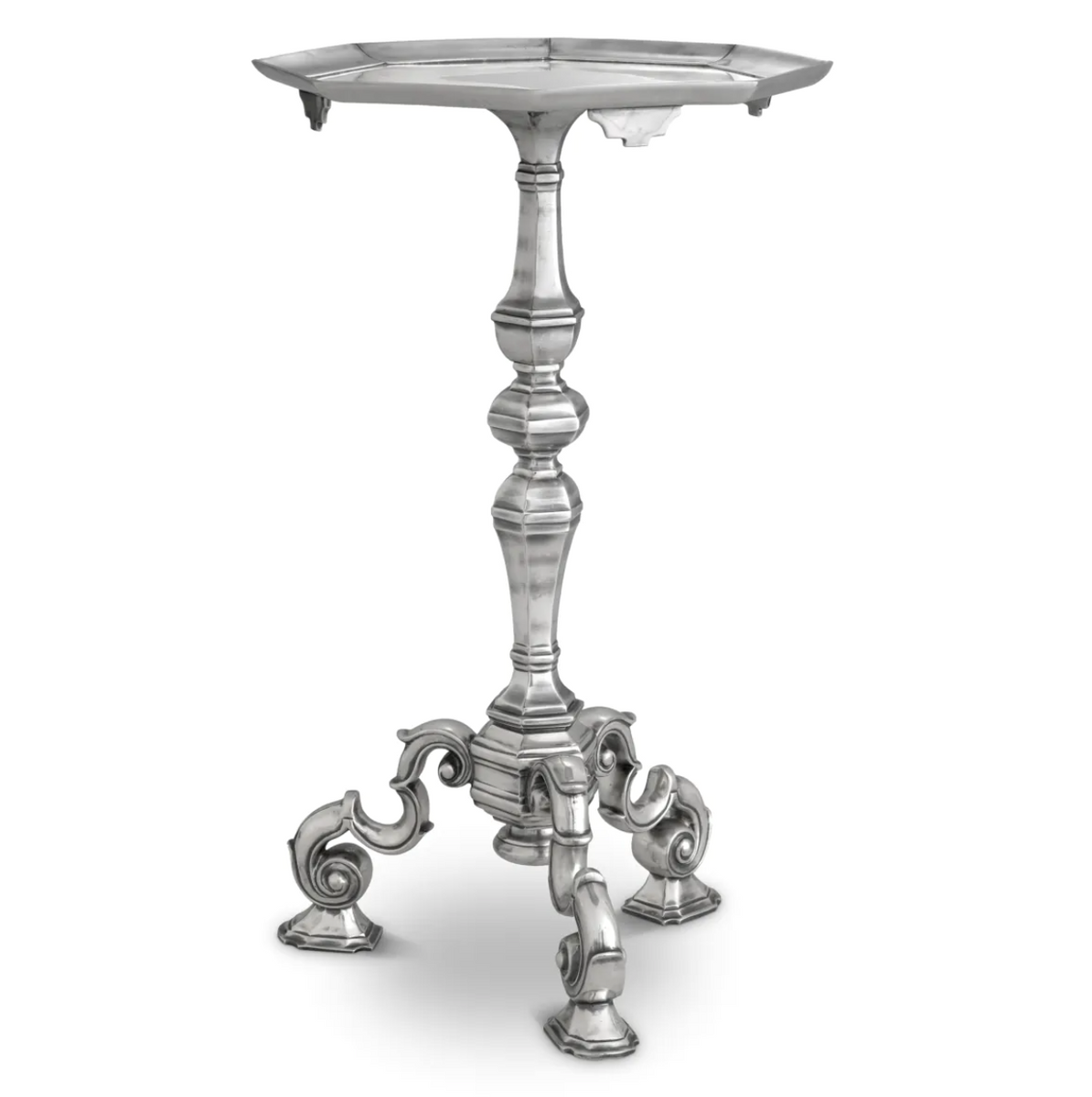 - The Eichholtz Verney side table in antique silver, with its sculptural form and intricate silhouette, evokes the opulent furniture styles favored by English and French aristocracy. Dimensions: L 37.5 cm | W 37.5 cm | H 66 cm
