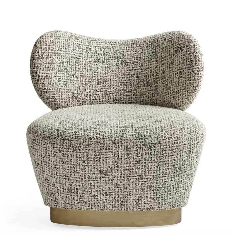 The Marvila swivel chair by Gianfranco Ferré Home is crafted from molded solid beechwood and engineered wood. Padding is polyurethane foam and Dacron. Upholstery is Category A fabric. Base is solid beechwood with a brushed brass finish. Dimensions: 74 x 71 x 75 cm