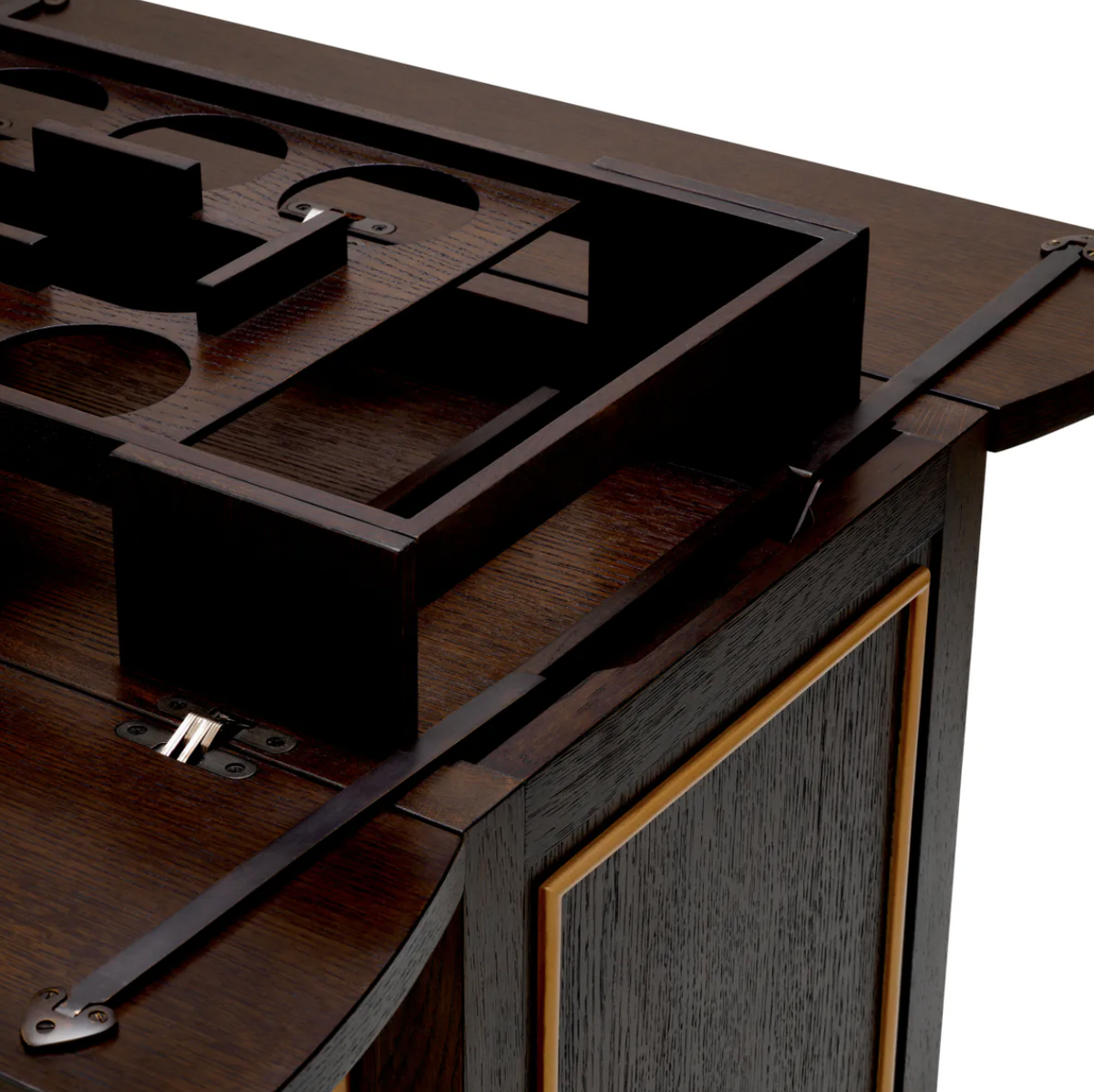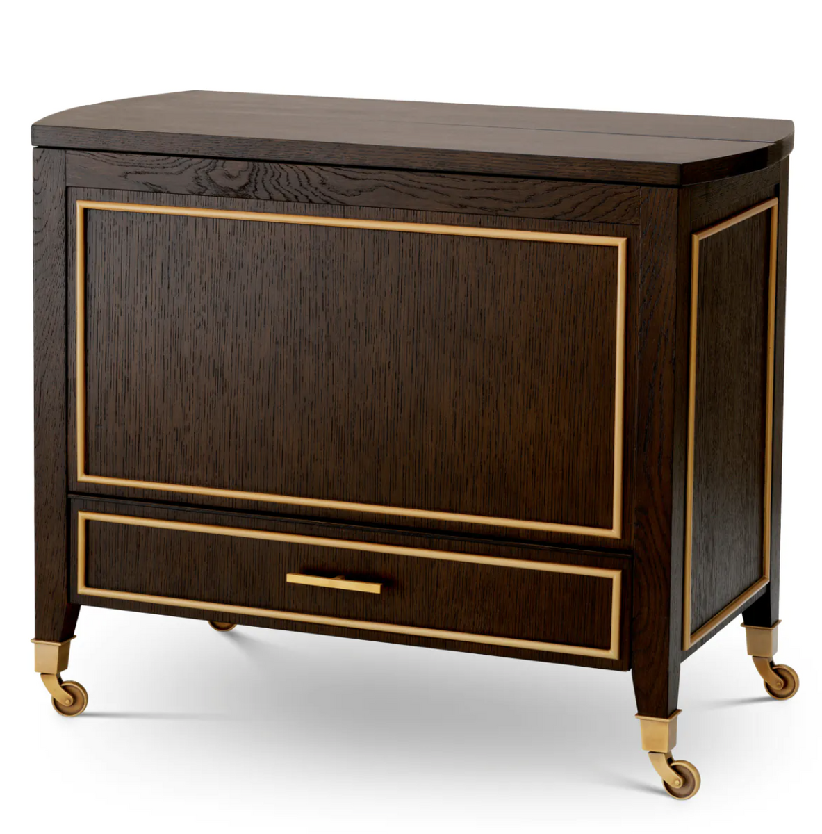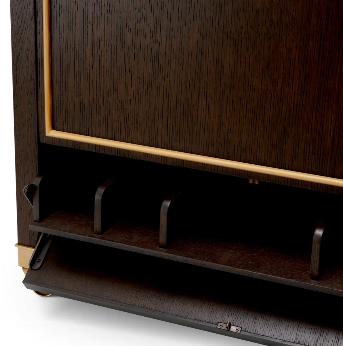 - The Eichholtz Galliano Bar features an Art Deco design in brown oak veneer paired with a brushed brass finish. It offers storage for bottles, drinks, and glassware.