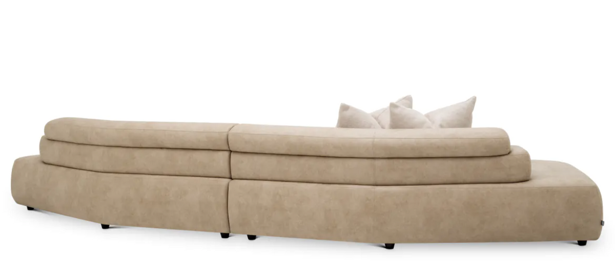 The Marvella sofa by Eichholtz in beige Valente faux leather features soft curves and plush cushions. It rests on contrasting black legs. Dimensions: W. 399 | D. 140 | H. 66 | SD. 68 | SW. 392 | SH. 40 | AH. 54 cm