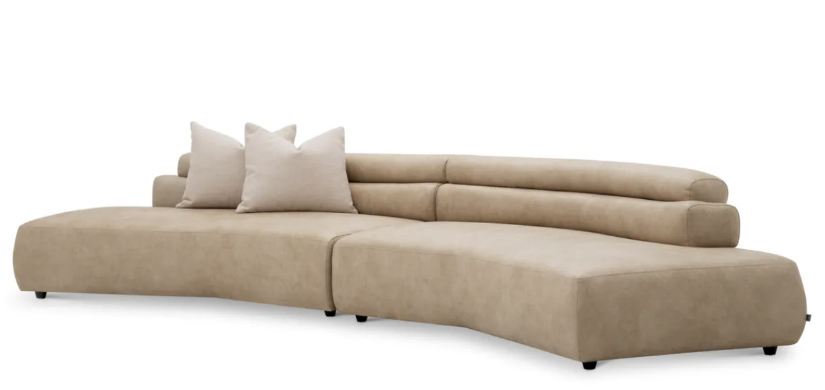 - The Marvella sofa by Eichholtz in beige Valente faux leather features soft curves and plush cushions. It rests on contrasting black legs.