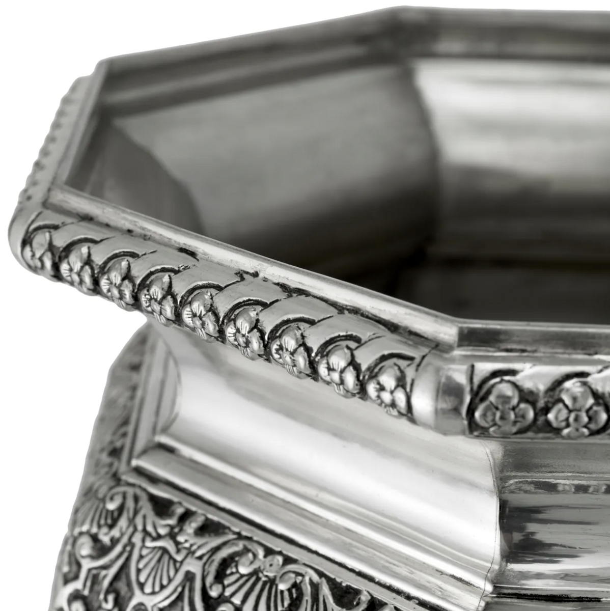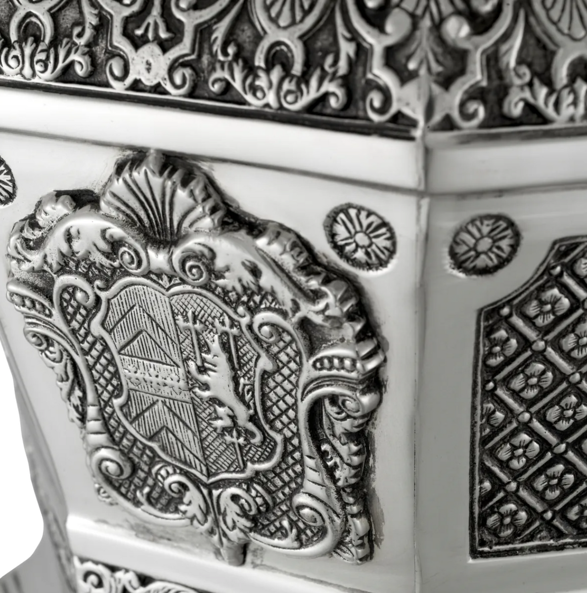 • The Eichholtz Walpole Cooler in plated silver, inspired by a pair of silver wine coolers crafted in the French style by William Lukin I, combines historical elegance with modern sophistication.
