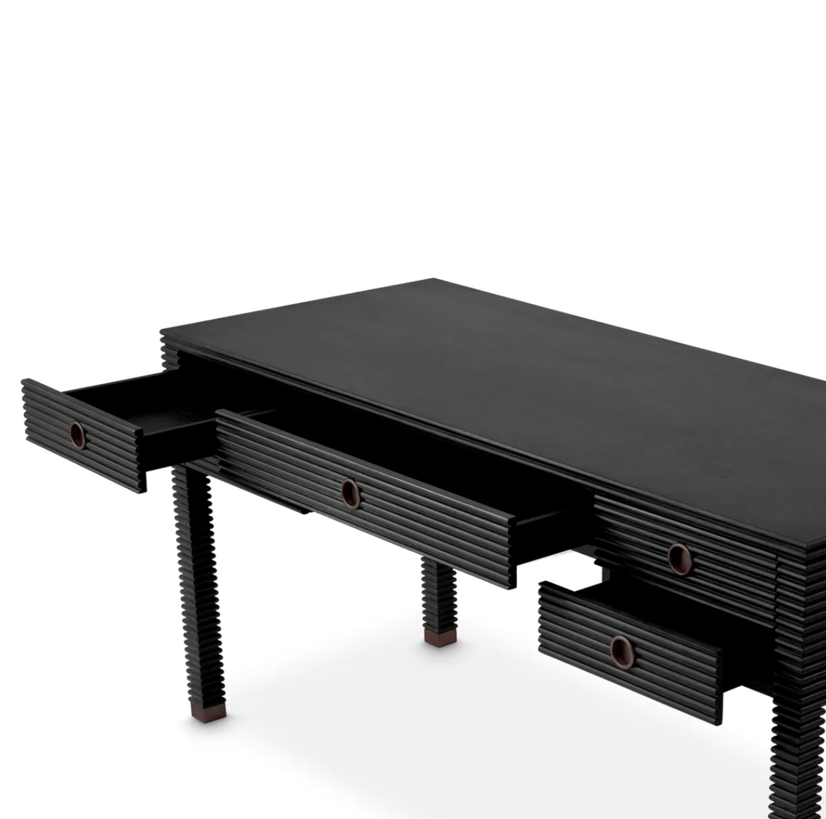 The Dimitrios Desk by Eichholtz, crafted from anthracite oak veneer with bronze hardware, combines refined design with everyday practicality. Featuring five spacious drawers, it provides ample storage for documents and essentials.