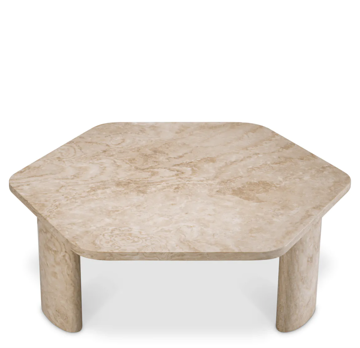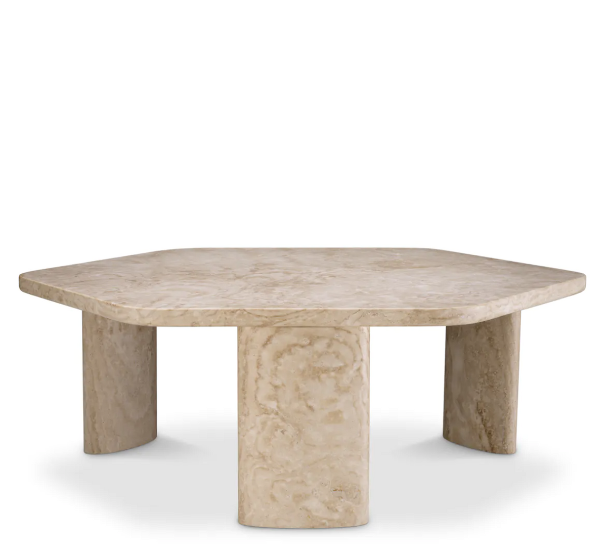 - The Zenitho coffee table by Eichholtz, crafted from solid travertine, captivates with its natural stone veining and warm, earthy tones.