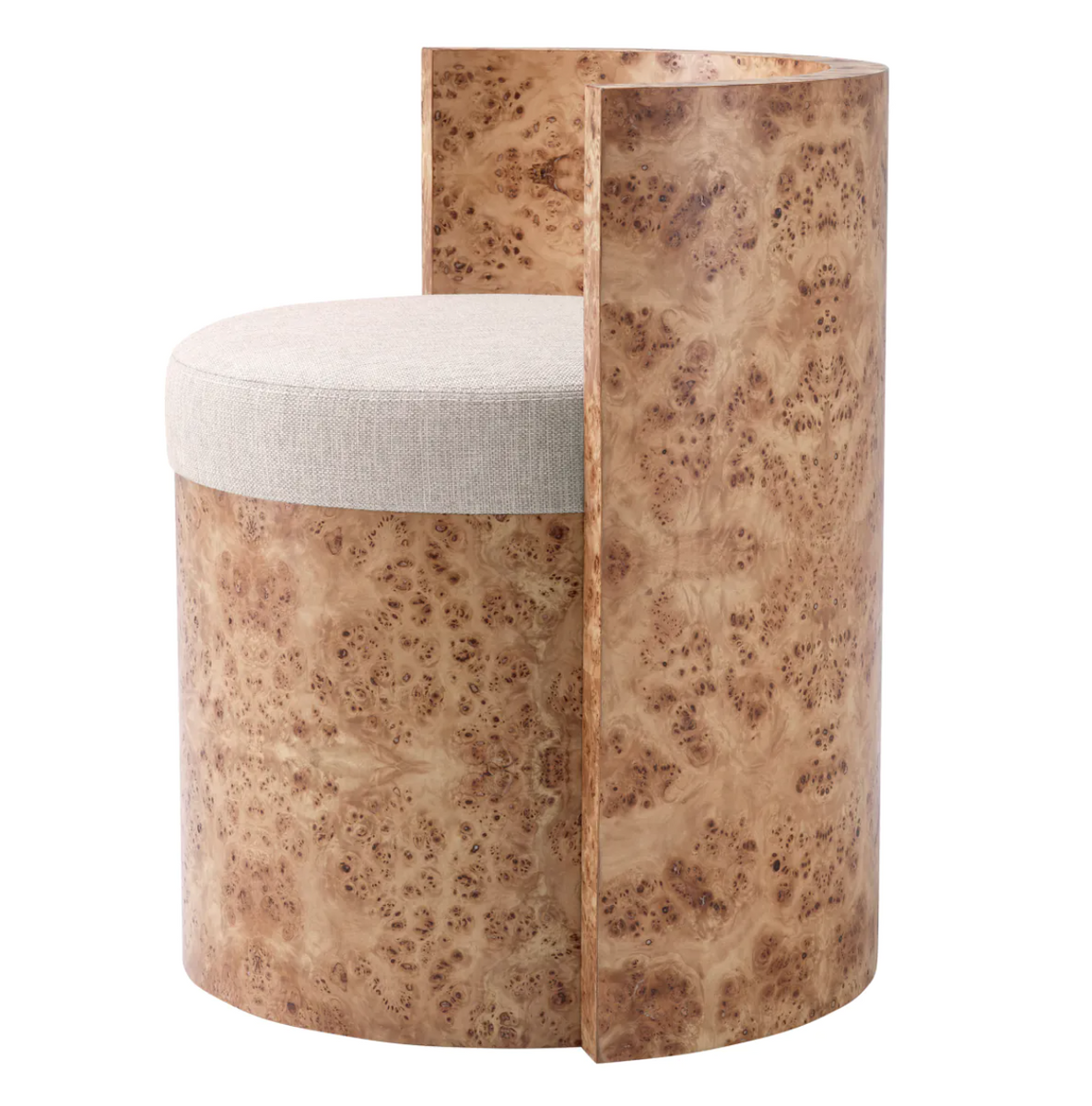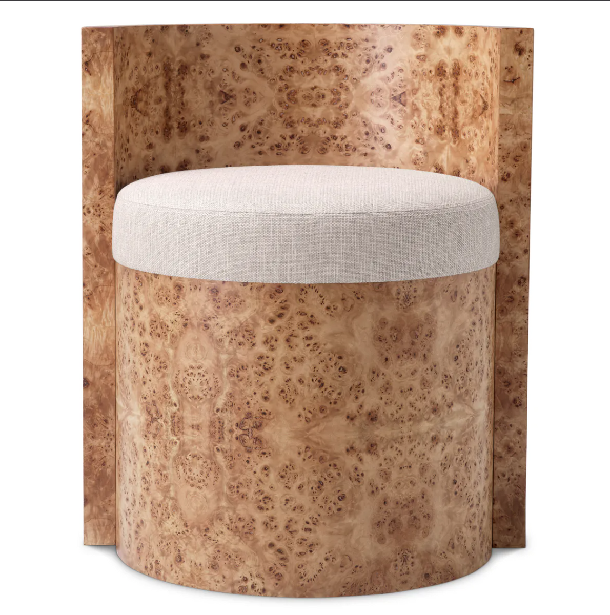 The Eichholtz Arcadia Chair, crafted from light brown poplar burl veneer (mappa burl), prized for its complex, wavy grain and striking color contrasts, captivates with its unique character. This unique veneer gives the design an organic, dynamic form, perfectly complementing the soft Loki natural fabric upholstery. The harmonious combination of rich textures and warm tones creates a calm, yet sophisticated composition – ideal for interiors that value subtle luxury and timeless style. Dimensions: W. 56 | D. 52 | H. 66 | SD. 48 | SW. 48 | SH. 48 | AH. 66 cm