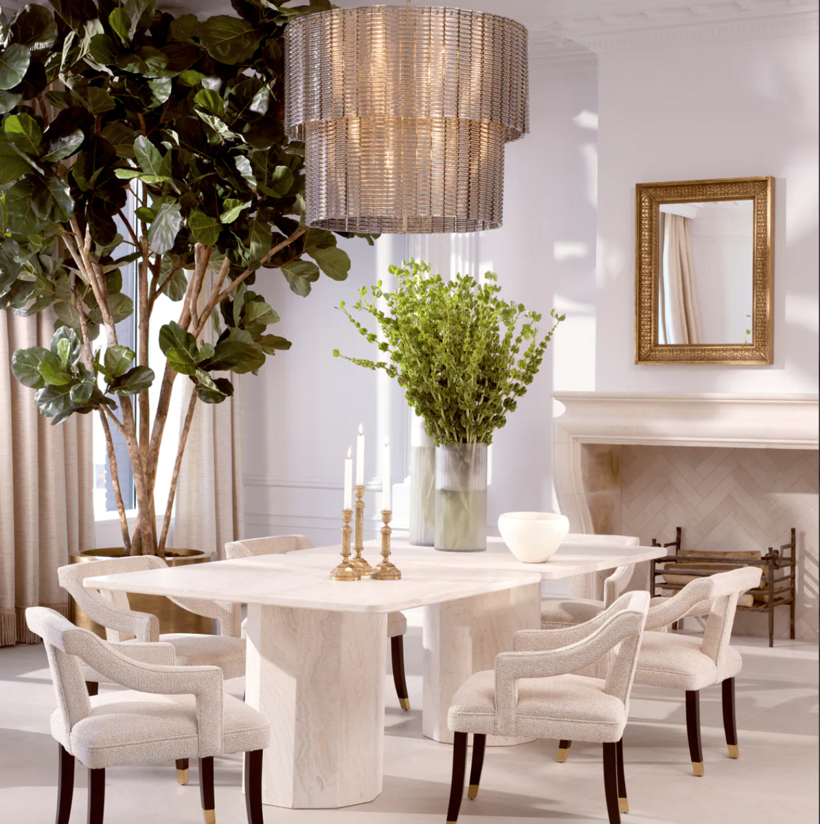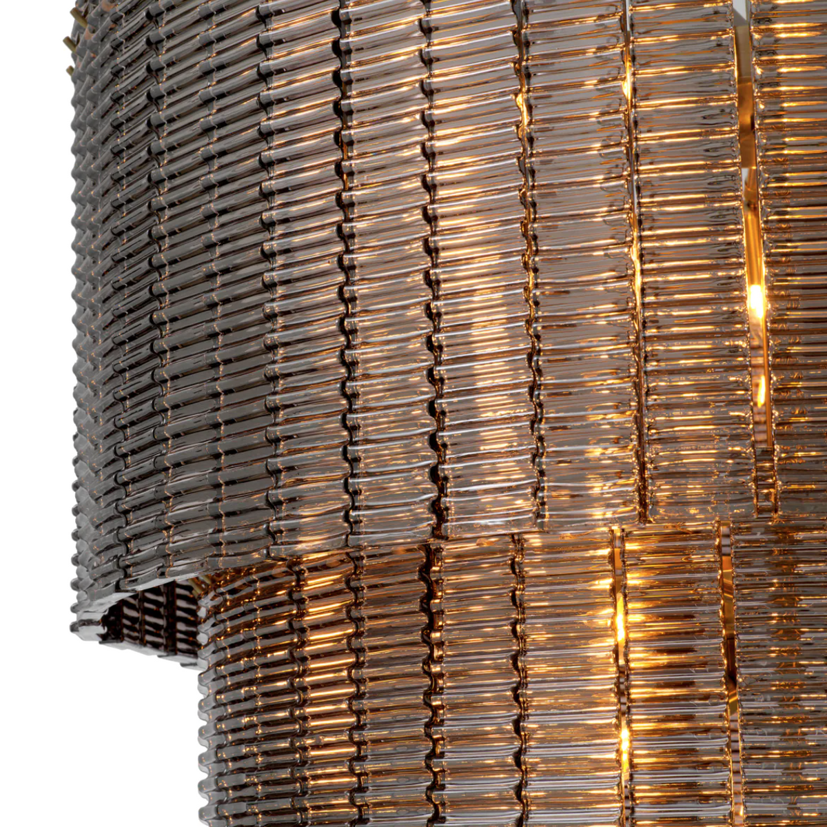 - The Eichholtz Imperial Double chandelier, in brushed brass and adorned with smoked glass, captures the spirit of ancient Greek architecture, combining historical charm with modern sophistication.