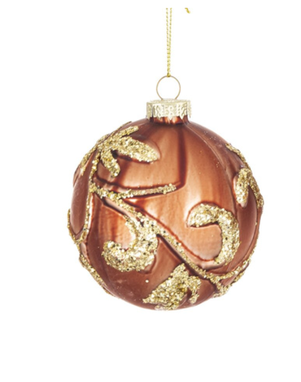 Christmas ornament - brown glass bauble with a geometric pattern and glitter embellishments. Dimensions: 8.5 x 7.5 x 7.5 cm