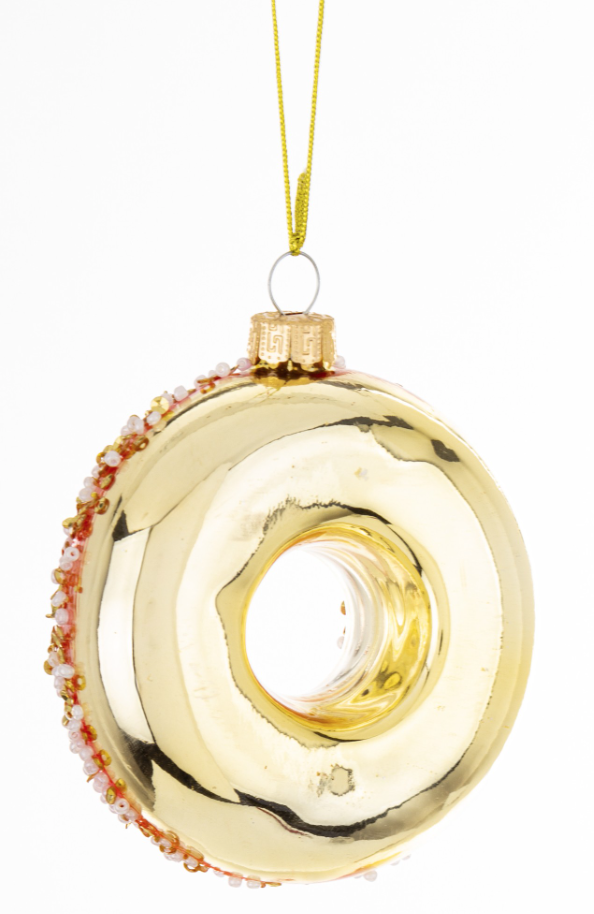 - Christmas ornament - a colorful glass donut with a hole, with hand-decorated gold and pink details. An original and perfect Christmas tree decoration. Dimensions: 9 x 9 x 3.5 cm